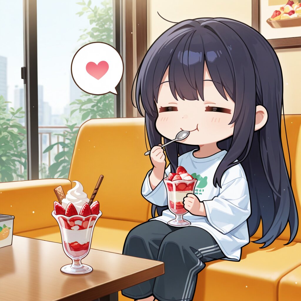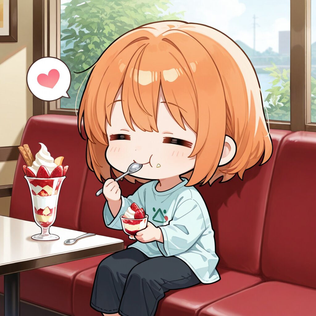 masterpiece,best quality,highres,highly detailed,general,chibi,1girl,solo,=_=,smile,long shirt,long pants,eating parfait,holding spoon,sitting sofa,in restaurant,spoken heart,