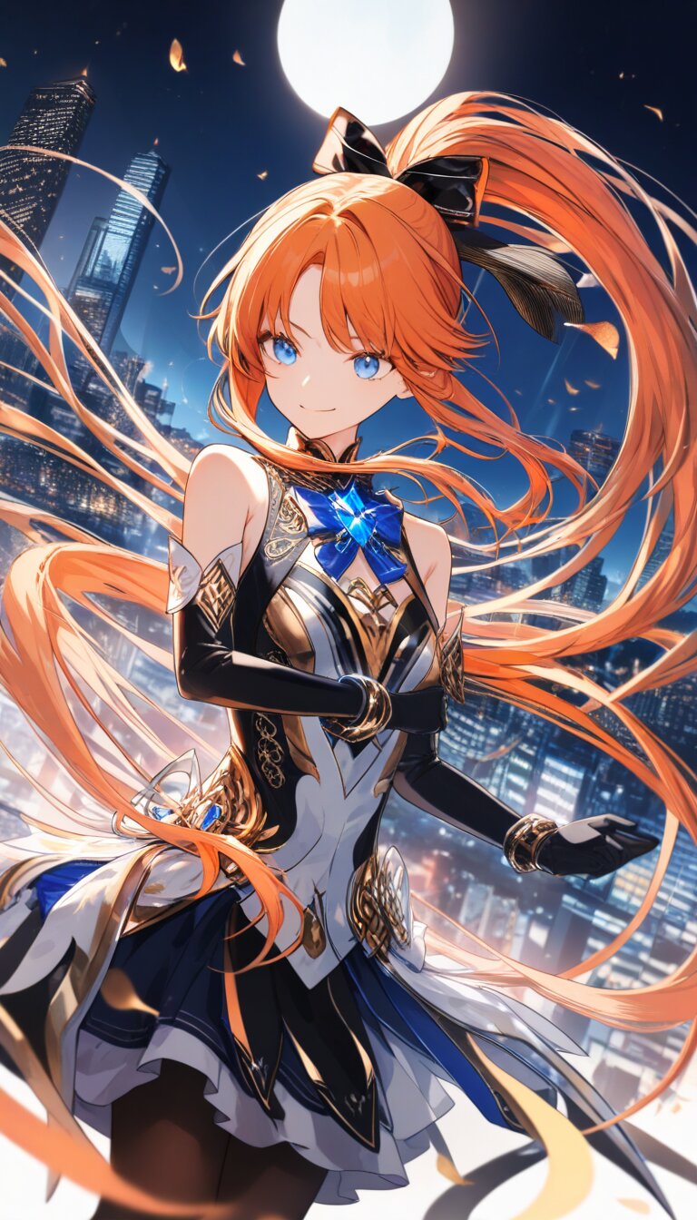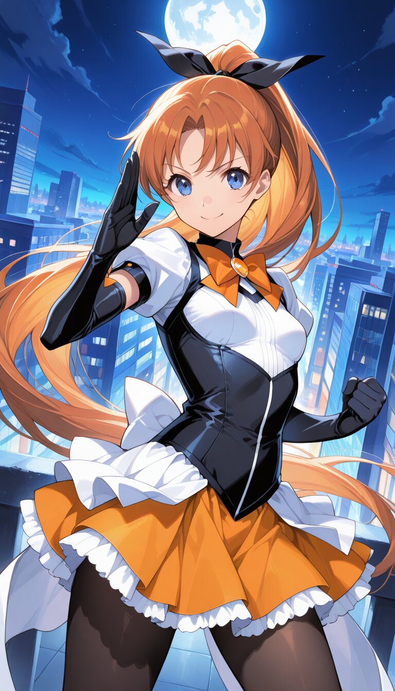 best quality,absurdres,8k,ultra detailed,very aesthetic, 1girl, beautiful ultra detailed, (an extremely beautiful 13-year-old girl), best lighting, beautiful, perfect anatomy, dynamic angle, (masterpiece:1.2), (best quality:1.2), (very aesthetic:1.2), (absurdres:1.2), (detailed background), newest, haneoka meimi, long hair, ponytail, bow, ribbon, blue eyes, orange hair, hair ribbon, very long hair, brown hair; gloves, elbow gloves, skirt, magical girl, black gloves, pantyhose, bowtie, (((small breasts))), (cowboy shot), (smile), ((city)), ((fighting stance)), (night, moon),