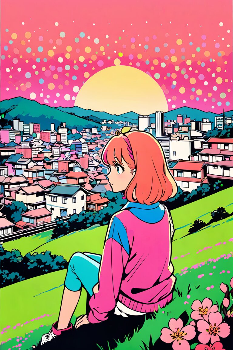 masterpiece, best quality, beautiful detailed eyes, ultra-detailed, finely detail, highres, vivid colors, kawaii illustration, retro style, Kyoto Animation, multicolor pastel city pop illustration, 1 girl, solo, ((peach blossom:1.5)), image captures the cheerful and colorful style of city pop illustration, urban vibe of city pop illustration, (Primary color painting), city pop art girl, city pop painting illustration, 80s fashion, 80s anime, sky, Japanese city pop illustration, sitting, flat color, (hill), (sitting on the hill:1.3)