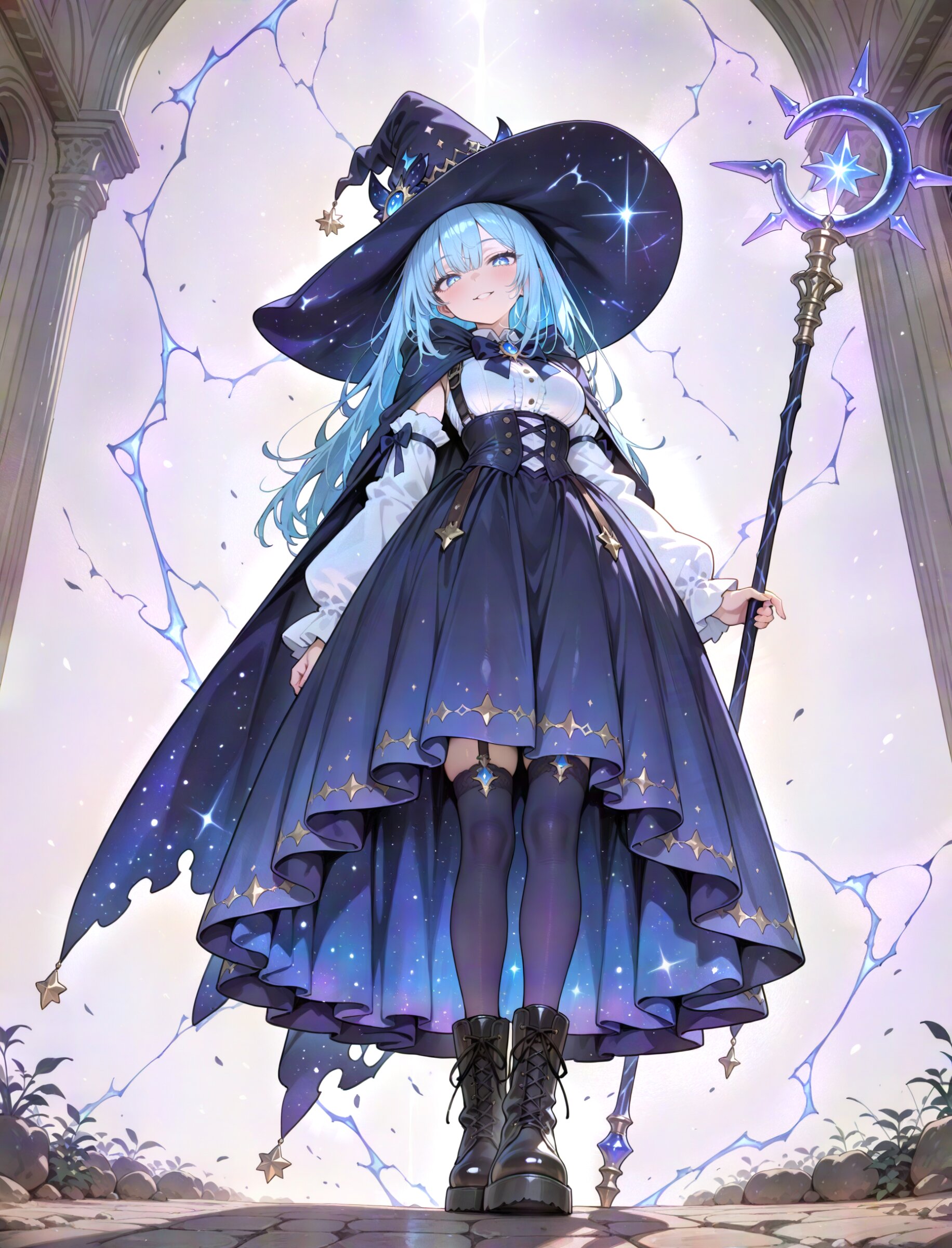 (close to viewer:1.15), knees out of frame from below, looking down , 1girl, witch girl, blue eyes, beautiful iridescence eyes, beautiful detailed eyes, beautiful light blue hair, long bangs, long disheveled beautiful hair, first-rate female bodies, perfect body, beautiful breasts, framed breasts, cool face, (Beautiful Lips:0.7),, long hair, (stylish beautiful witch dress:1.2), detached sleeves, (cute blue and dark blue witch girl costume:0.9), (white blouse:1.3), bow tie, witch long skirt (overskirt:1.1) black cloak, (blue galaxy witch hat:1.1), lace-up boots on feet, stockings and suspenders,, mysterious face, seductive smile,mysterious smile , thunder magic, lightning, floating magic staff, underlighting, fleeing, midair, flying, masterpiece, best quality, amazing quality, very aesthetic, absurdres, newest, you can add scenery, (volumetric lighting), To make the background more distinctive. professional art lots of details, , overexposure, shiny-glistening, (watercolor style:0.0), (pastel color style:1.0) 4ur4_illu,shiny, glowing, glowing particles, sepia star sky, <lora:noline (1):-0.5> <lora:sdxl2-flat2-512b:-0.2> <lora:facelightup_xl_v10:0.5> <lora:V2_yakumo_alchemy:0.5> <lora:Aura_illu:0.1>
