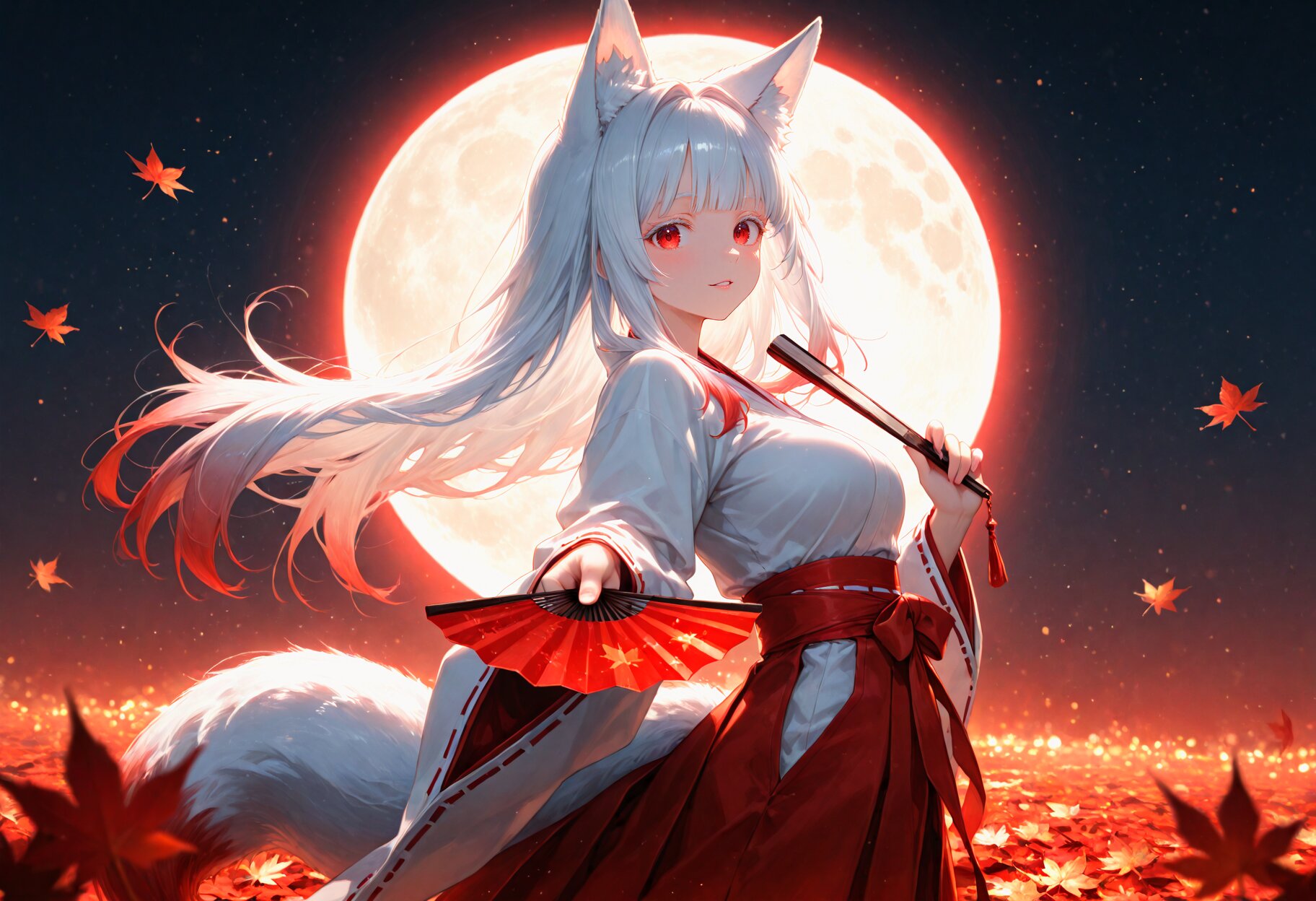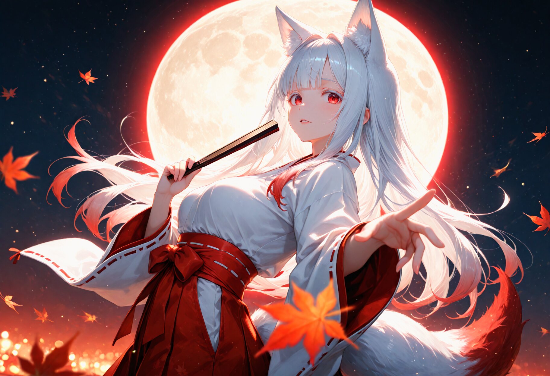 at autumn leaves,(many maple leafs:1.2),floating leafs,at night,full moon,blurry foreground,night sky,deep shadow,cinemtic lighting,leafs wind, 1girl,japanese traditional miko,dancing,holding folding_fan, upper body,from side,reaching towards viewer,looking at viewer, Particles of light,complex,Natural Light,Attention to detail,Movie Scenes, BREAK 1girl,solo,20 years old,medium breasts,(white heir:1.1),blunt bangs,(long hair),(red gradient hair),straight hair,(white fox tail),(red gradient tail),white fox ear,animal ear fluff,tareme,red eyes,(white eyelashes:1.3),cute face,fair skin,red dip-dye hair,hair intakes, gentle smile,parted lips,dutch angle,<lora:xl_more_art-full_v1:0.6>,<lora:great_lighting:0.6>,<lora:flat_sdxl:-0.5>,<lora:outline_xl_kohaku_delta_spv5x:-0.4>,<lora:Detailer_NoobAI_Incrs_v1:0.8>,detailed,, appropriate posture,appropriate configuration,ideal ratio body proportions,perfect anatomy, <lora:Fixhands_anime_bdsqlsz_V1:1>, masterpiece,best quality,newest,absurdres,highres,ultra high res,8K UHD,hyper-detailed,