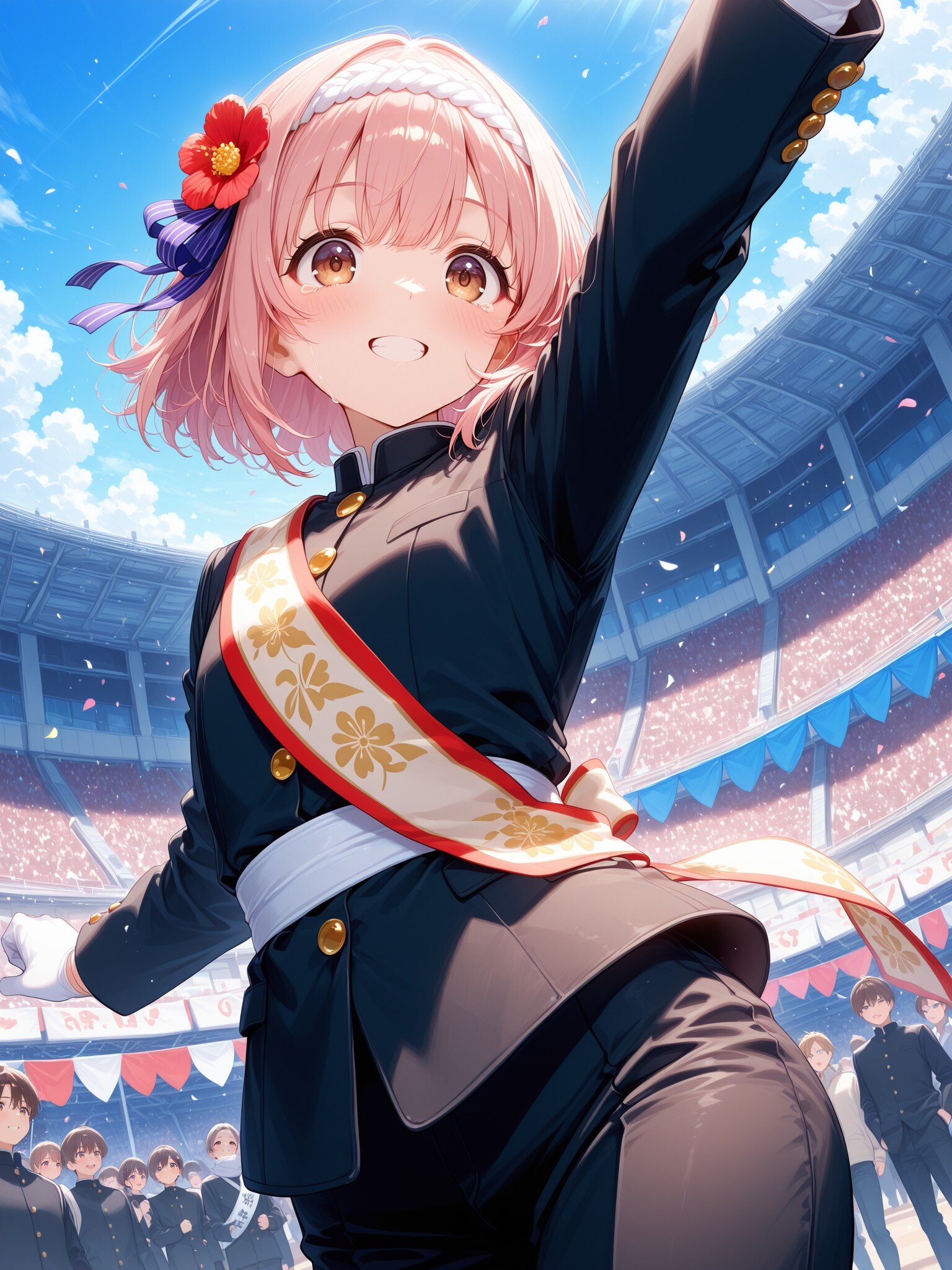(school yard,cheering),(crowded,audience, students:1.3),1girl,light pink hair,light pink eyes,loose wavy hairstyle,short bob cut,floral hair accessory,happy,(traditional black gakuran, oversized, gold buttons:1.2),(beautiful brown eyes:1.1),(teen, cute,tareme:1.3),day, outdoors, sports festival, headband,(cowboy shot|from below:1.3),(flat chest,curvy :1.1)