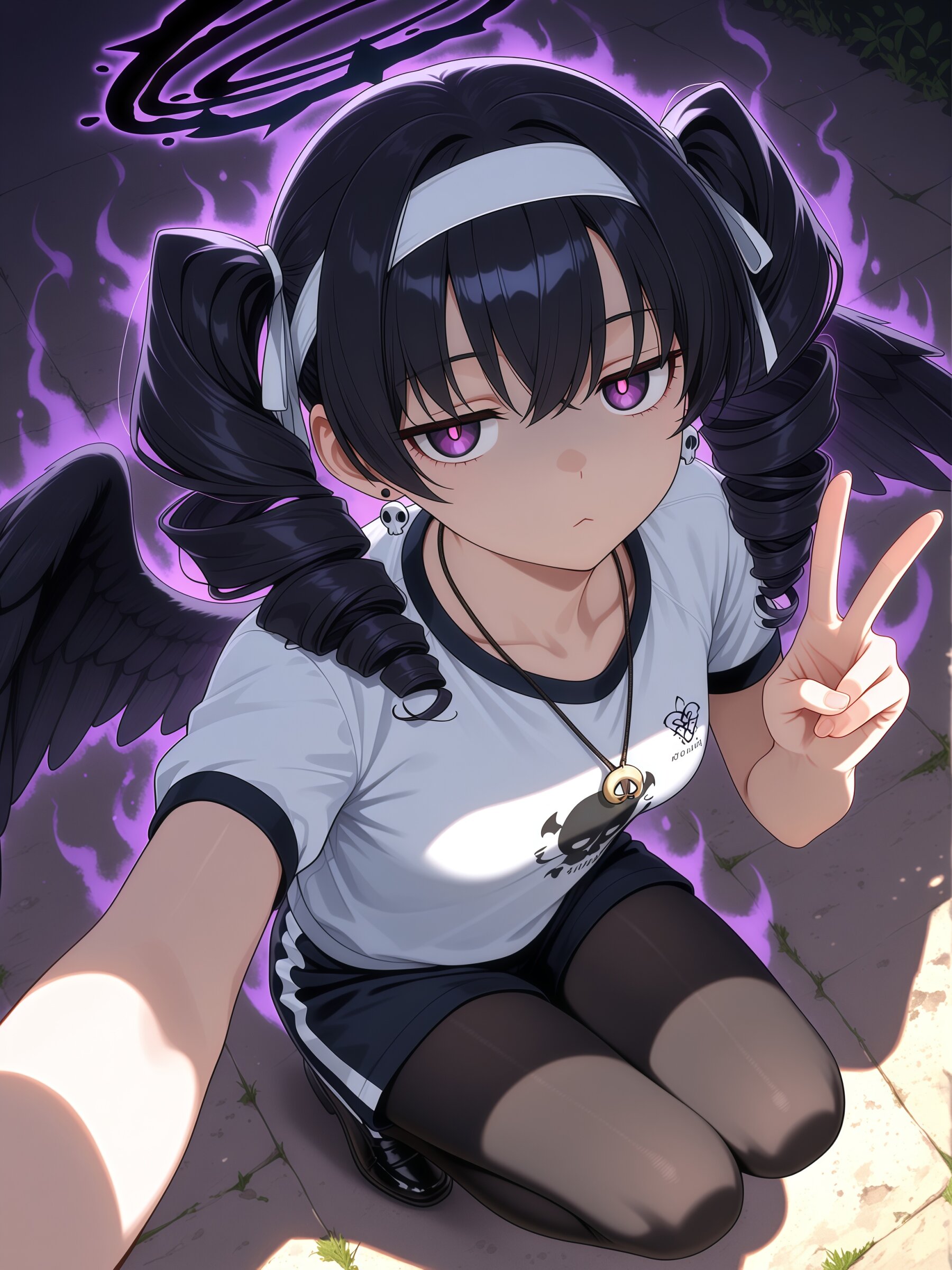 (masterpiece, best quality, ultra-detailed, 8k illustration, anime style, natural lighting), 1girl, squatting with legs together, (in the shade:1.2), selfie, (peace sign:1.4), high-angle view from above, casual and relaxed mood, gentle smile, soft sunlight filtering through trees, earthy ground, outdoor schoolyard background, realistic shadows, black hair, (twin drills:1.4), bangs, purple eyes, jitome, (expressionless:1.2), :<, (black wings folded behind:1.1), wearing skull motif accessories (necklace, earrings),(dark aura, black smoky haze floating subtly around her:1.3), black halo, small breasts, white hachimaki headband, gym uniform, white short-sleeve t-shirt, black shorts, black tights, black shoes, natural body proportions, soft breeze moving hair strands, shaded face, shadow covering the upper half of her face,