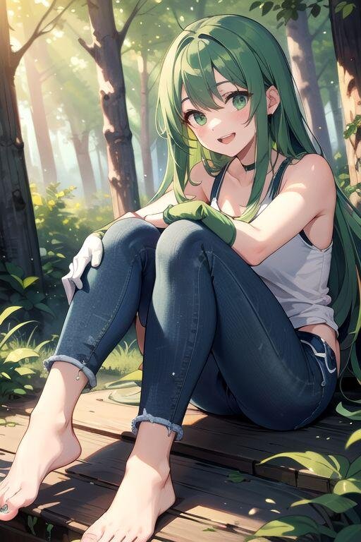green hair, very long hair, green eyes, gloves, barefoot, (long toes:1.3), (long jeans:1.4),smile,open mouth, forest background