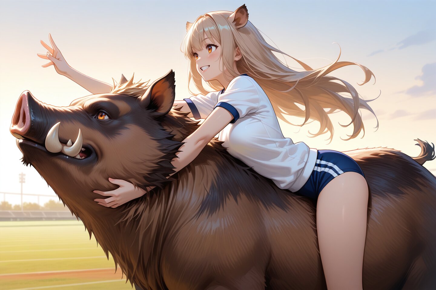 nice hands, perfect hands, perfect anatomy, perfect structure, (background is ground in school. boar), ((ride on animal, girl on animal)), (On a Morning, reaching arm, pointint at Forward, the girl is animal rider, open mouth grin smile), battle pose:1.2, outdoors, 1girl, solo, cowboy shot, from side, dynamic angle, dynamic composition, (She is wearing an Japanese school gym uniform). ultra detailed lips, ultra detailed face and hair, kawaii, adorable, cute, (boar girl, light brown hair, long hair, amber eyes, wild boar ears), medium breasts, wide hip,, anime style, anime color,, masterpiece, amazing quality, very aesthetic, high resolution, ultra-detailed, absolute, newest, 2d, semi-realistic, moe heroine, sharp focus,, <lora:elf-san_alpha1(AnimagineV31):0.7> <lora:elf-san_alpha4(IL1.0):0.7>