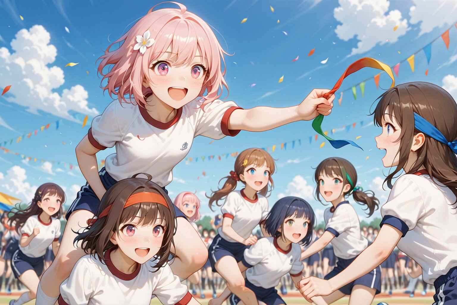 japanese school gym uniform. light pink hair,light pink eyes,loose wavy hairstyle,short bob cut,floral hair accessory,happy smile, Japanese school sports day cavalry battle (kibasen), the girl with pink hair is seated astride on her teammates’ shoulders (all female students), all characters are high school girls wearing PE uniforms, red and blue team headbands, no male characters, cheerful and energetic atmosphere, the pink-haired rider leans forward with a bright, determined smile, reaching to grab the opponent’s headband, sunny blue sky, white field lines, colorful flags, cheering crowd of girls in the background, dynamic low-angle composition, vivid colors, detailed anime style, cinematic lighting, wholesome and youthful, full body,, anime style, anime color,, masterpiece, amazing quality, very aesthetic, high resolution, ultra-detailed, absolute, newest, 2d, semi-realistic, moe heroine, sharp focus,
