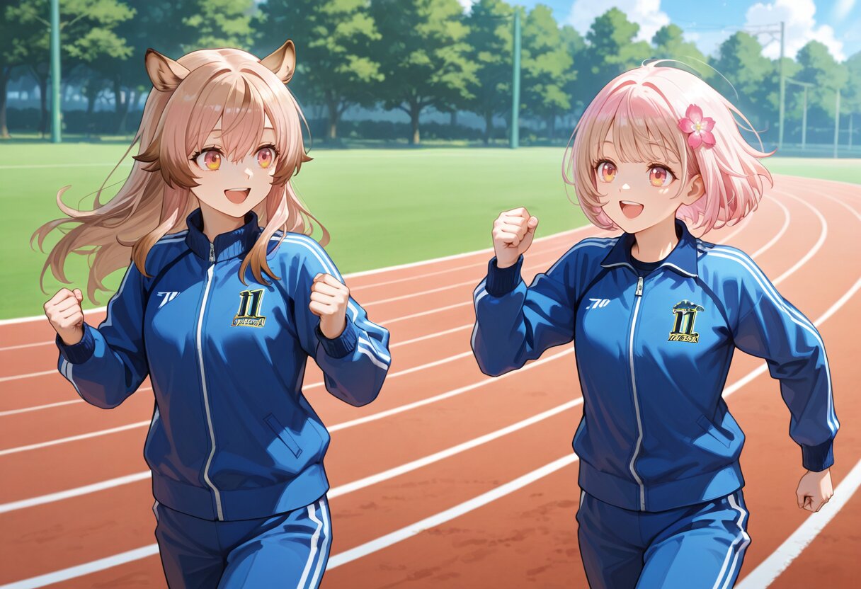 2girls,(light brown hair,long hair,amber eyes,wild boar ears,bangs,clenched hands),smile,open mouth,(long sleeves,jersey,blue Tracksuit,long sports pants,hands up),slender girl,looking at another,running,sports ground,outdoors,cowboy shot BREAK 2girls,(light pink hair,light pink eyes,loose wavy hairstyle,short bob cut,flower hair accessory,clenched hands,hands up),happy smile,open mouth,(long sleeves,jersey,blue Tracksuit,long sports pants),slender girl,looking at another,running,sports ground,outdoors,cowboy shot BREAK masterpiece,best quality,highres,highly detailed,detailed eyes,general,sports ground,outdoors,running
