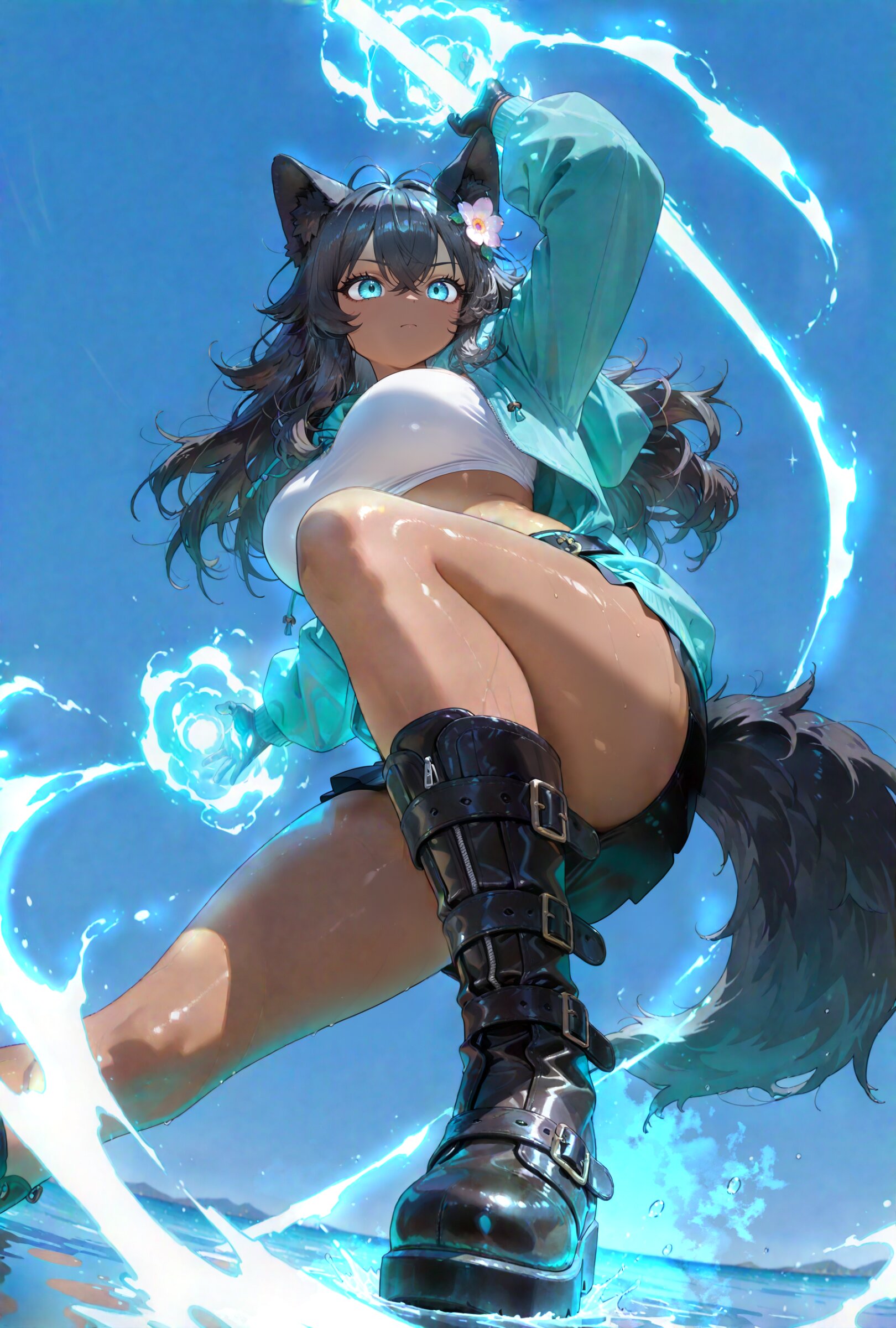 (fisheye,fisheye lens angle:1.0), (low angle shot:1.2) , (simple background:1.2) 1girl, black wolf ears, dark skin, young beautiful girl, large breasts, tall, wolf tail, (aristocratic features), (Black Hair:1.2) (disheveled long hair over ears:1.3) messy hair ornament flower, (perfect turquoise eyes:1.3) long eyelashes,, wearing turquoise hood down and white tube top leather gloves, lether miniskirt, belt boots, turquoise hoodie, water magic, , kung fu attack, kung fu pose, kung fu action, (swirling energy,energy magic,energy:1.2), water magic, holding water sword, great clear water, reflective water, , super fine concept art, hard surface, 8K, unreal engine, masterpiece, best quality, amazing quality, very aesthetic, absurdres you can add scenery, (volumetric lighting), To make the background more distinctive. professional art lots of details, , overexposure, shiny-glistening, (watercolor style:0.5), (pastel color style:0.5) <lora:noline (1):-0.5> <lora:sdxl2-flat2-512b:0.0> <lora:facelightup_xl_v10:0.5>