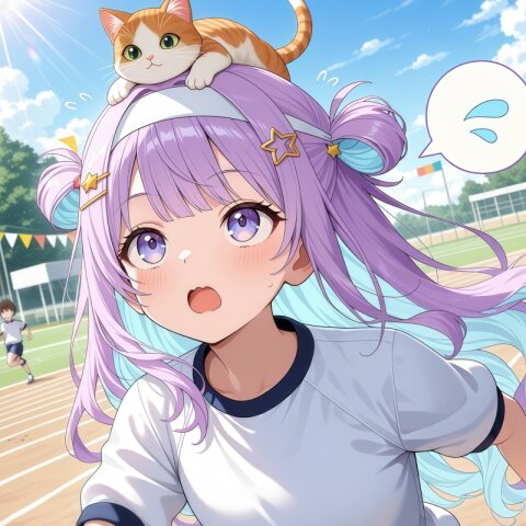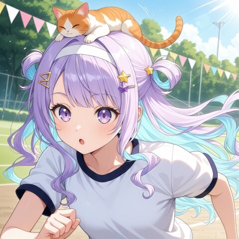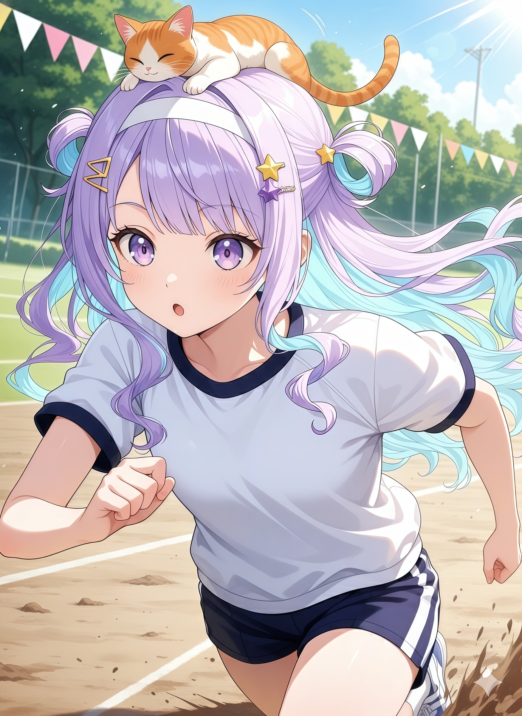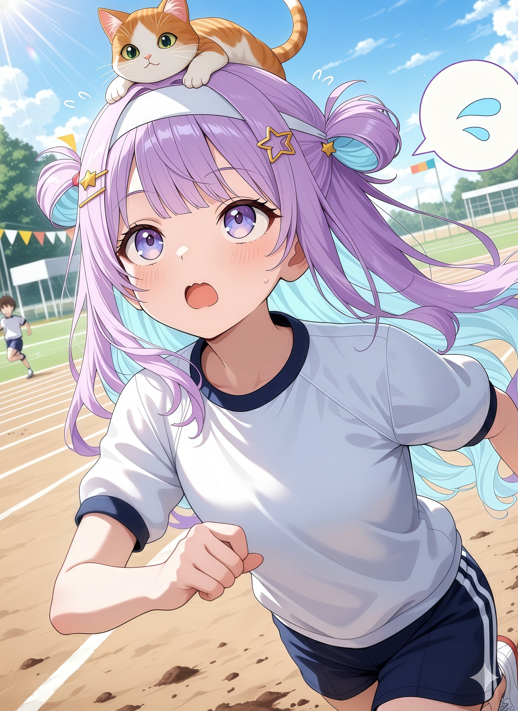 (masterpiece, best quality, ultra-detailed, intricate details, anime style, 8k illustration), 1girl, soft anime face, teenage, pastel purple hair, (light blue inner hair:1.5), fluffy long hair, loosely wavy hair, soft flowing hair, straight-cut bangs, long hair with two side buns, loose curls, star-shaped hairpin, calm violet eyes, looking up, wide open mouth, wavy mouth, spoken flying sweatdrops, cat on head, running, school sports day, dynamic action, sunlight, :o, white hachimaki headband, gym shirt, white t-shirt, short sleeves, shorts, upper body, dynamic angle shot, diagonal angle, blurred background, (white lines on ground:1.1), flags fluttering in the background, playful and skillful scene, dirt ground, schoolyard, blue sky, warm daylight,