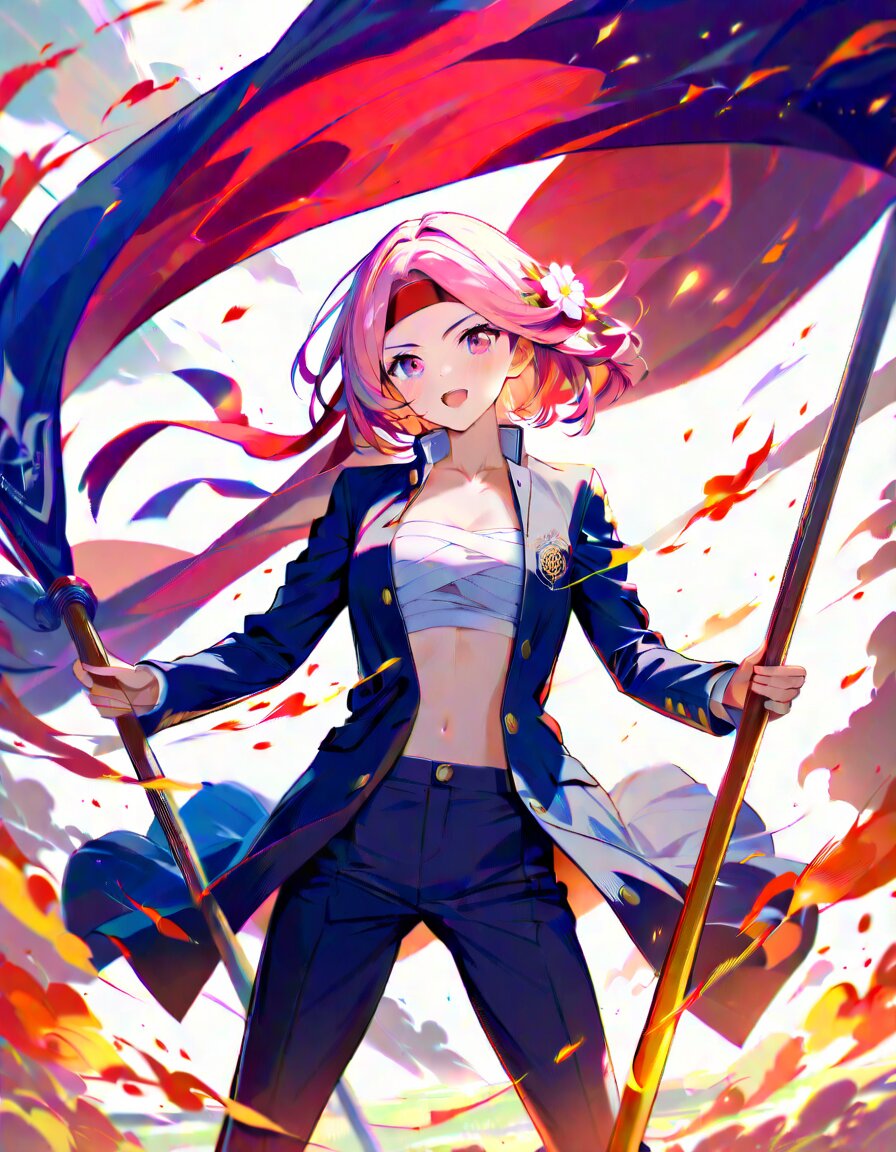 light pink hair,light pink eyes,loose wavy hairstyle,short bob cut,(floral hair accessory:1.4),happy smile, 1 girl,(gakuran:1.4),open shirt, tanding,school sports field,sports day,cheering,cowboy shot,gakuran jacket knee-length,jacket hem straight,(white sarashi:1.4),(long red headband:1.4),headband flowing diagonally to waist,(holding long large flags in both hands:1.5),flags flowing diagonally with wind,serious expression,open mouth,bright strong sunlight,sun rays from top right,light and shadow on jacket and sarashi,highlights on hair and headband,flags catching sunlight,vibrant colors,soft lighting,1 PM,detailed,clear character design,accurate school uniform,dynamic pose,energetic,motion,action,lively,clothing and hair natural flow,wind effect,(background of flames and radiant sun:1.5),(blazing light:1.4),, (best quality,masterpiece:1.4),(high resolution,super fine illustration:1.36),shiny skin,finely,detailed face,japaneese idol