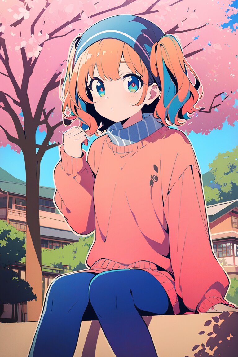 masterpiece, best quality, beautiful detailed eyes, ultra-detailed, finely detail, highres, vivid colors, kawaii illustration, retro animation, Kyoto Animation, multicolor pastel city pop illustration, 1 girl, solo, ((peach tree:1.5)), image captures the cheerful and colorful style of city pop illustration, urban vibe of city pop illustration, (Primary color painting), city pop art girl, city pop painting illustration, 1980s fashion, 1980s anime, sky, Japanese city pop illustration, sitting, flat color, (hill), (sitting on the hill:1.3)