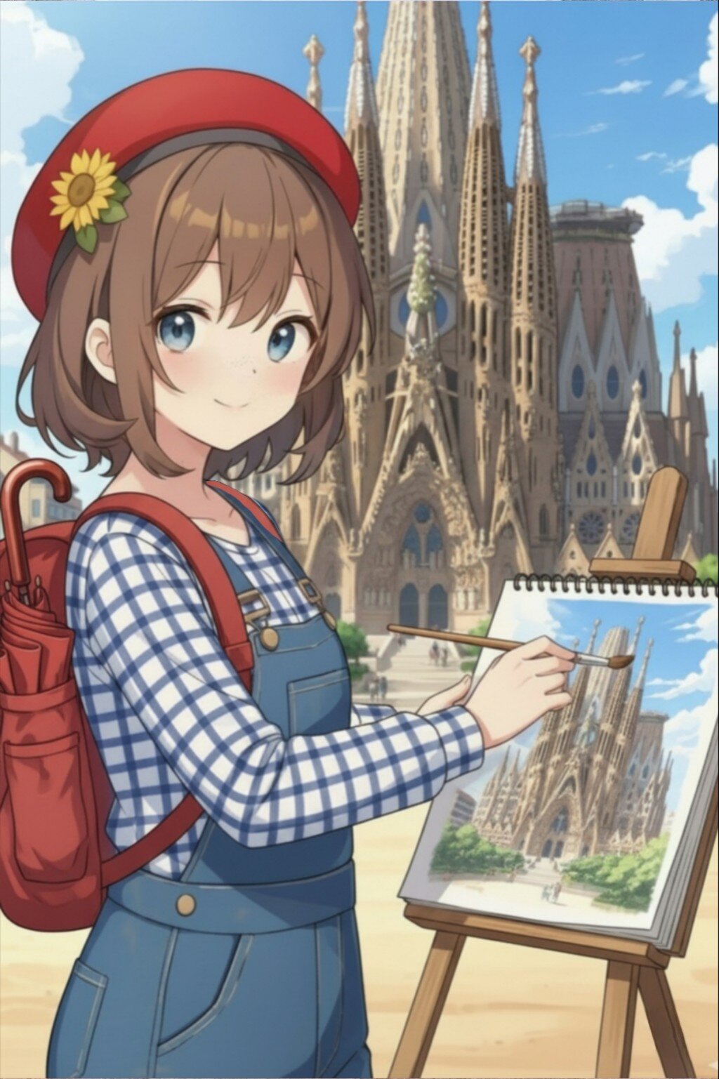 anime style, a young girl with short brown hair and blue eyes, slight freckles, wearing a red beret with a sunflower pin, a blue and white plaid shirt, and denim overalls, standing outdoors and painting a beautiful landscape of the Sagrada Familia on an easel, a red backpack and a red umbrella are visible, bright sunny day, clear sky, art tools, peaceful atmosphere