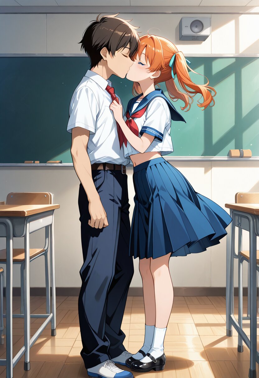 masterpiece,best quality,amazing quality,general, fine detail, official art, 1girl, cute face, an image there is kissing going on between two people in the video, 1girl, school uniform, skirt, 1boy, indoors, anime coloring, orange hair, twintails, blue eyes, blue sailor color, white shirt, red_neckerchief, blue skirt, long_skirt, white socks, mary janes, pleated skirt, midriff, serafuku, navel, kiss, neckerchief, shirt, long hair, closed eyes, crop top overhang, sailor collar, short sleeves, hair ribbon, socks, crop top, ribbon, classroom, hetero,
