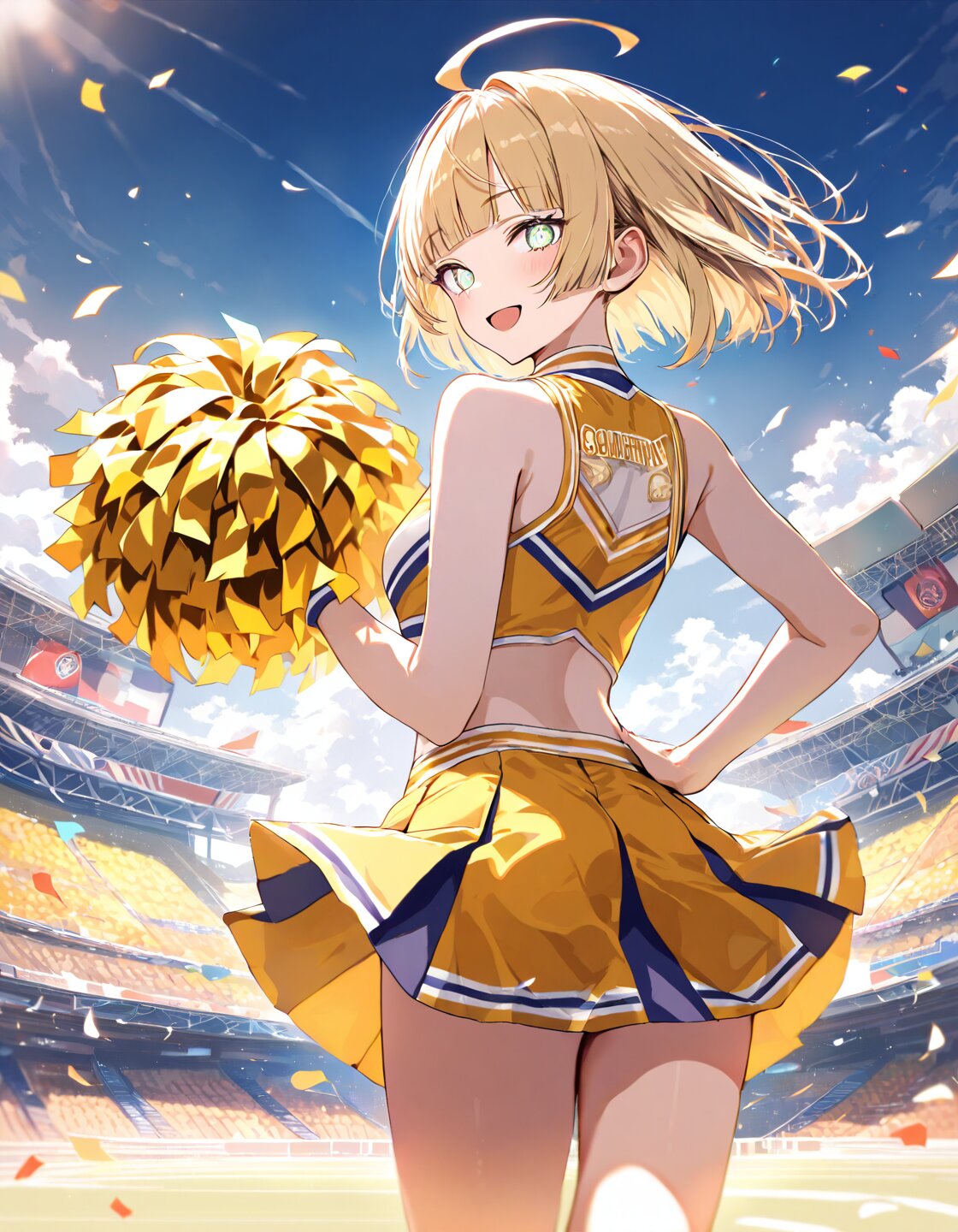solo, 1boy, blonde hair, gren eyes, blunt bangs, ahoge, short hair, straight hair, hime cut, delicate face, detailed face, detailed skin, masterpiece, best quality, insanely detailed, highly detailed, intricate, detailed eyes, beautiful eyes, beautiful face, beautiful hair, beautiful, 16k, cheerleader,looking at viewer,looking back, detailed and vibrant, (Stadium seating:1.2), (golden cheerleader uniform:1.5), sleeveless, (golden pleated mini skirt:1.5), golden sneakers, white knee socks, standing on one leg, cheerful, dancing, (one hand on hip:1.3), (one hand raised up:1.3), (holding large golden pom-poms in both hands:1.5), at noon, light atmosphere, lens flare, sunlight, sunbeam, shining lights, open mouth, cheerful smile, floating hair, floating skirt, (from behind:1.3), wide view