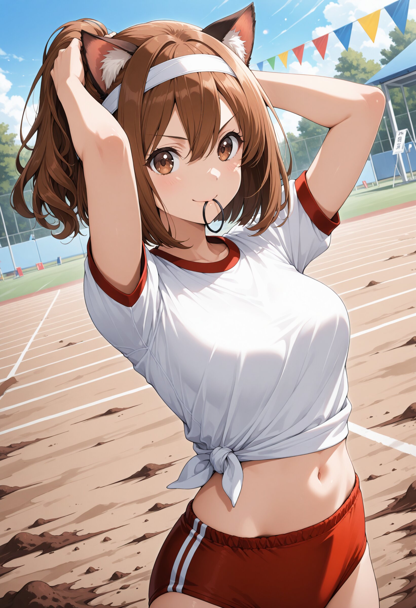 (masterpiece, best quality, ultra-detailed, anime style, 8k illustration), 1girl, brown cat ears, brown eyes, chestnut brown wavy bob hair, hair between eyes, medium breasts, holding a hair tie in her mouth, tying her hair, ponytail, upper body, natural pose, smile, v-shaped brow, determined face, confident expressions, school sports day, hachimaki headband, gym shirt, red buruma, white t-shirt, tied shirt, short sleeves, navel, dynamic angle shot, diagonal angle, blurred background, flags fluttering in the background, playful and skillful scene, dirt ground, schoolyard, blue sky, warm daylight,