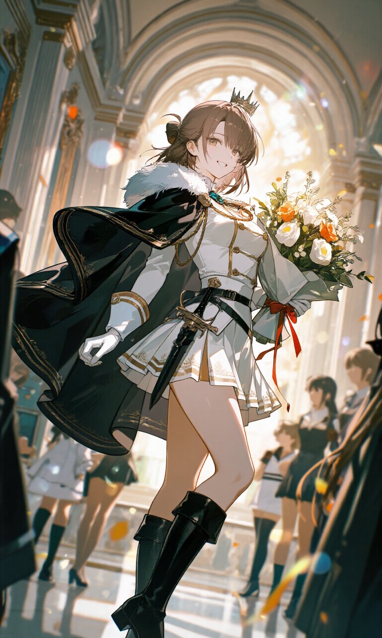lococo, platinum_(shimmering_dew)_(arknights), A 16-year-old girl with (half updo hairstyle with platinum light brown hair:1.3) and beautiful platinum light brown eyes stands in a luxurious ballroom wearing a (White Prince costume:1.5) with long sleeves, a (black luxurious Cape:1.3), and a (luxurious mini skirt:1.3). She has an ahoge and wears (black luxurious boots:1.3), (White gloves:1.2), and a (crown:1.3), with a (dagger on waist:1.3). Her alluring facial features radiate optimism and enthusiasm as she smiles lightly while (holding a bouquet in hand:1.5). She is (surrounded by friends:1.8) in the palace ballroom, which features lococo architecture with dreamy lighting, lens flare, and bloom effects. The romantic academia atmosphere is enhanced by lots of flowers and a light birthday celebration mood. Her medium breasts and energetic physique complement her intelligent and captivating presence. The hyperrealistic photo style captures every intricate detail of her costume and the opulent surroundings.