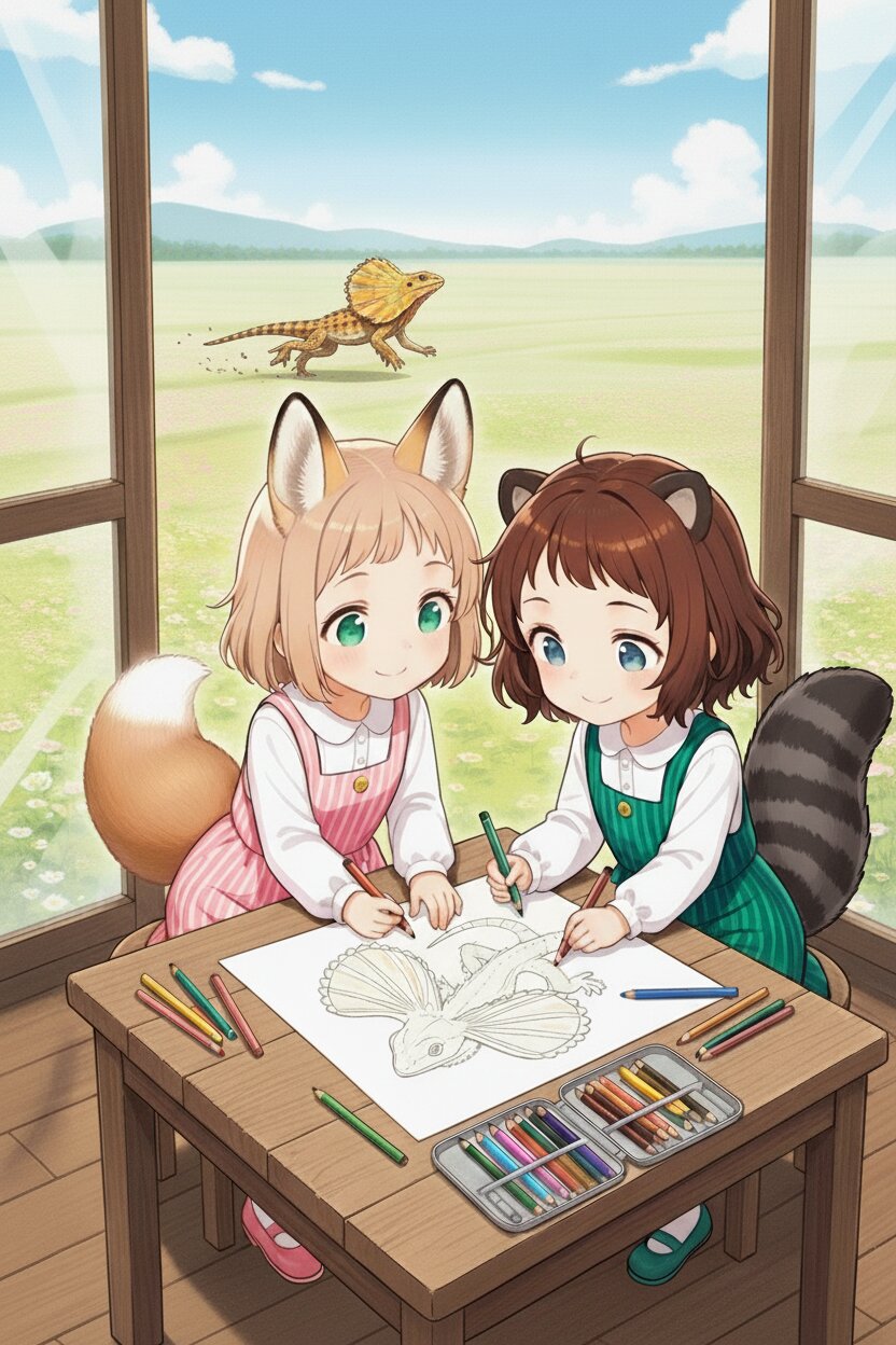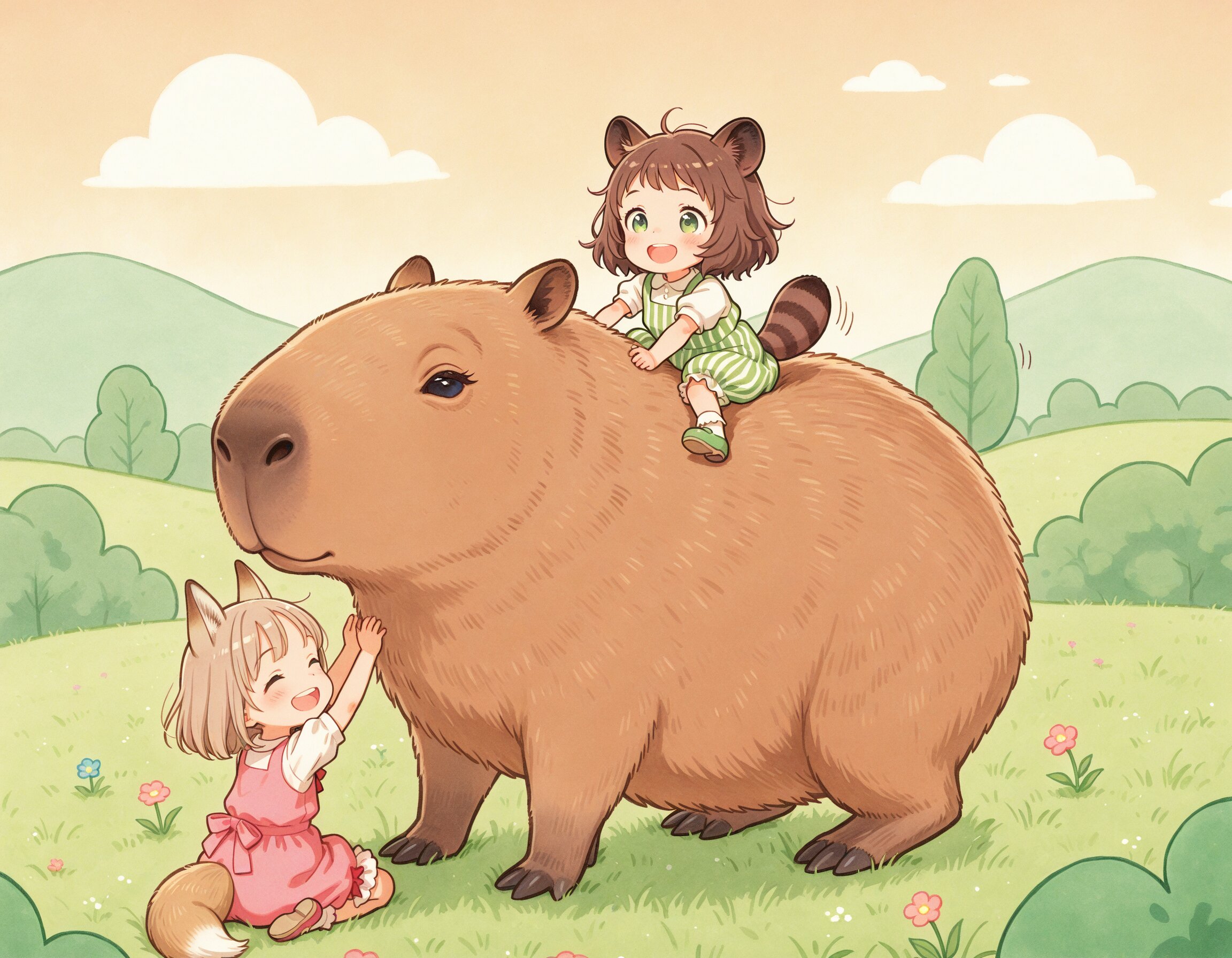 2girls, loli, mid, general, traditional media, picturebook-style, (colored pencil drawing), pastel colors, soft tone, fine lineart, no outline, (drawing lines, Paper texture:1.2), cute, deformed, ultra-detailed background, Very detailed and textured costumes, (barasui:0.1), (oyari ashito:0.1), (masterpiece, best quality), dynamic angle, dynamic composition, dynamic pose, cute capybara, playing together, outdoors, grassy field, flowers, sitting, riding, smiling, laughing, happy, heartwarming, wholesome, warm light BREAK light brown hair, medium hair, choppy bangs, blue eyes, (light brown fox ears, Light brown fox tail with white tip), pink pinafore dress, frilled bloomers, BREAK dark brown hair, short hair, messy hair, short bangs, green eyes, tareme, (dark brown raccoon ears, dark brown raccoon tail with striped pattern), green pinafore dress, frilled bloomers,