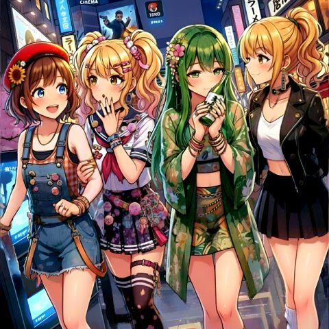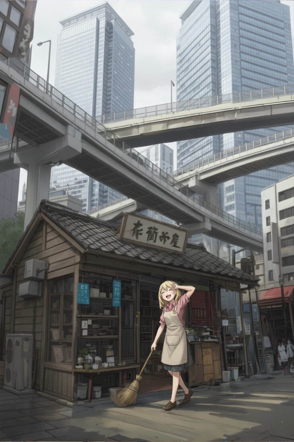 Contrasting scene: A smiling girl in an apron sweeps a traditional wooden antique shop with a bamboo broom, overshadowed by massive big city skyscrapers and intersecting elevated highways. She looks up happily, wiping sweat. Focus on the juxtaposition of old and new architecture.