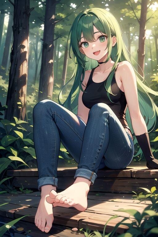 green hair, very long hair, green eyes, gloves, barefoot, (long toes:1.3), (long jeans:1.4),smile,open mouth, forest background