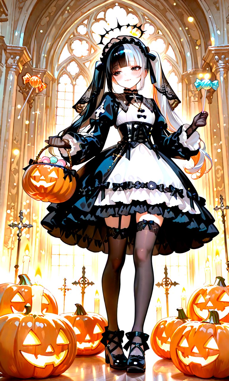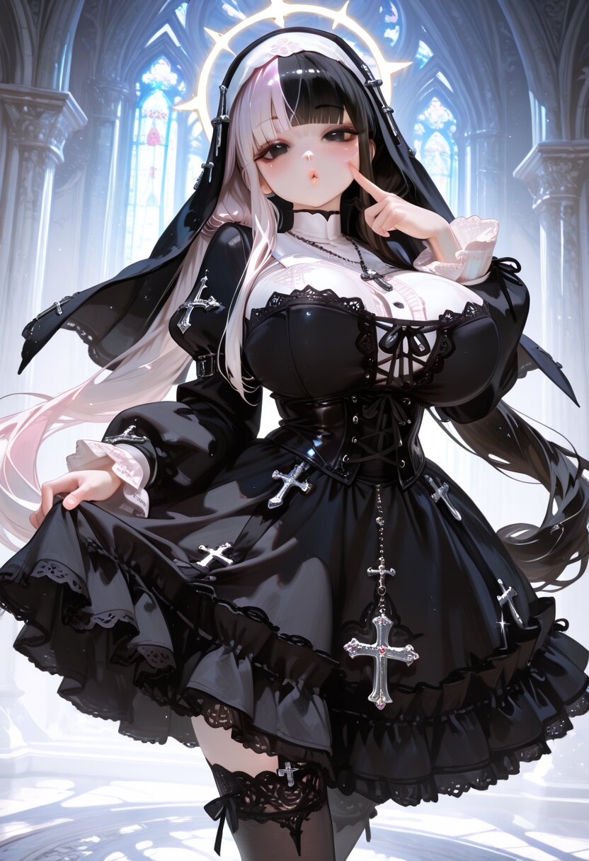 Nun Lolita outfit, elegant gothic dress inspired by a nun’s habit, layered black and white frilly skirt with lace trim, high collar, puffed sleeves, corset bodice with delicate embroidery, long flowing veil with lace edges and small cross ornaments, thigh-high stockings with lace tops, heeled Mary Jane shoes, rosary necklace with a silver cross, soft glowing halo-like light, gothic and holy aesthetic,
