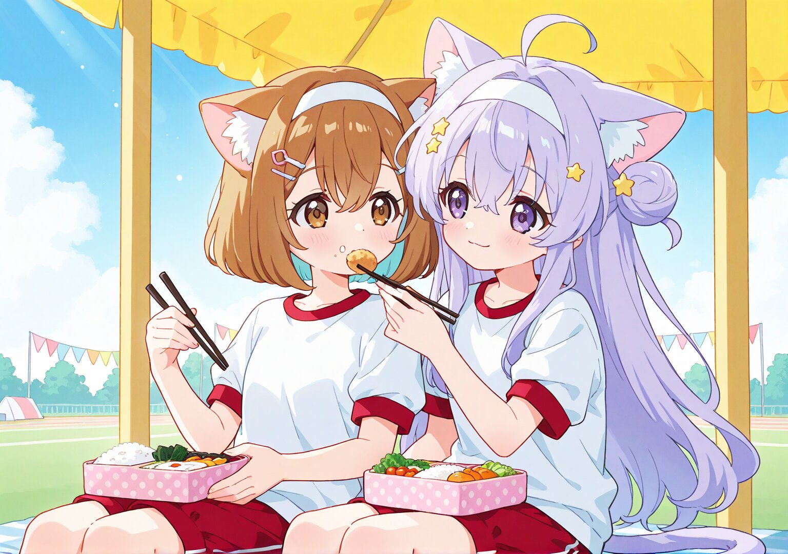 two girls sitting close together on pastel picnic blanket during school sports day lunch, feeding each other with chopsticks, soft gentle expressions, warm sunlight, dreamy pastel tones, colorful bento box with rice balls, omelette, fruits, vegetables, open lunch boxes between them, fluttering flags in the background, faint tents and blue sky, soft wind, kawaii anime style, pastel dreamy atmosphere, high quality, masterpiece, gentle depth of field 1st girl: brown cat ears, brown eyes, chestnut brown wavy bob hair, hair between eyes, loose inward curls, natural cat tail, wearing japanese school gym uniform (white T-shirt with red trim, red bloomers), white headband tied around forehead 2nd girl: soft cute girl with soft lavender hair and light blue inner highlights, long hair with two side buns and loose curls, one stray hair (ahoge), large bright purple eyes, gentle smile, faint glow, star-shaped hairpin, pastel dreamy look, wearing japanese school gym uniform (white T-shirt with red trim, red bloomers), white headband tied around forehead, (soft pastel color palette1.5), (pale colors:1.3), watercolor texture, matte finish, subtle shading, minimal contrast,