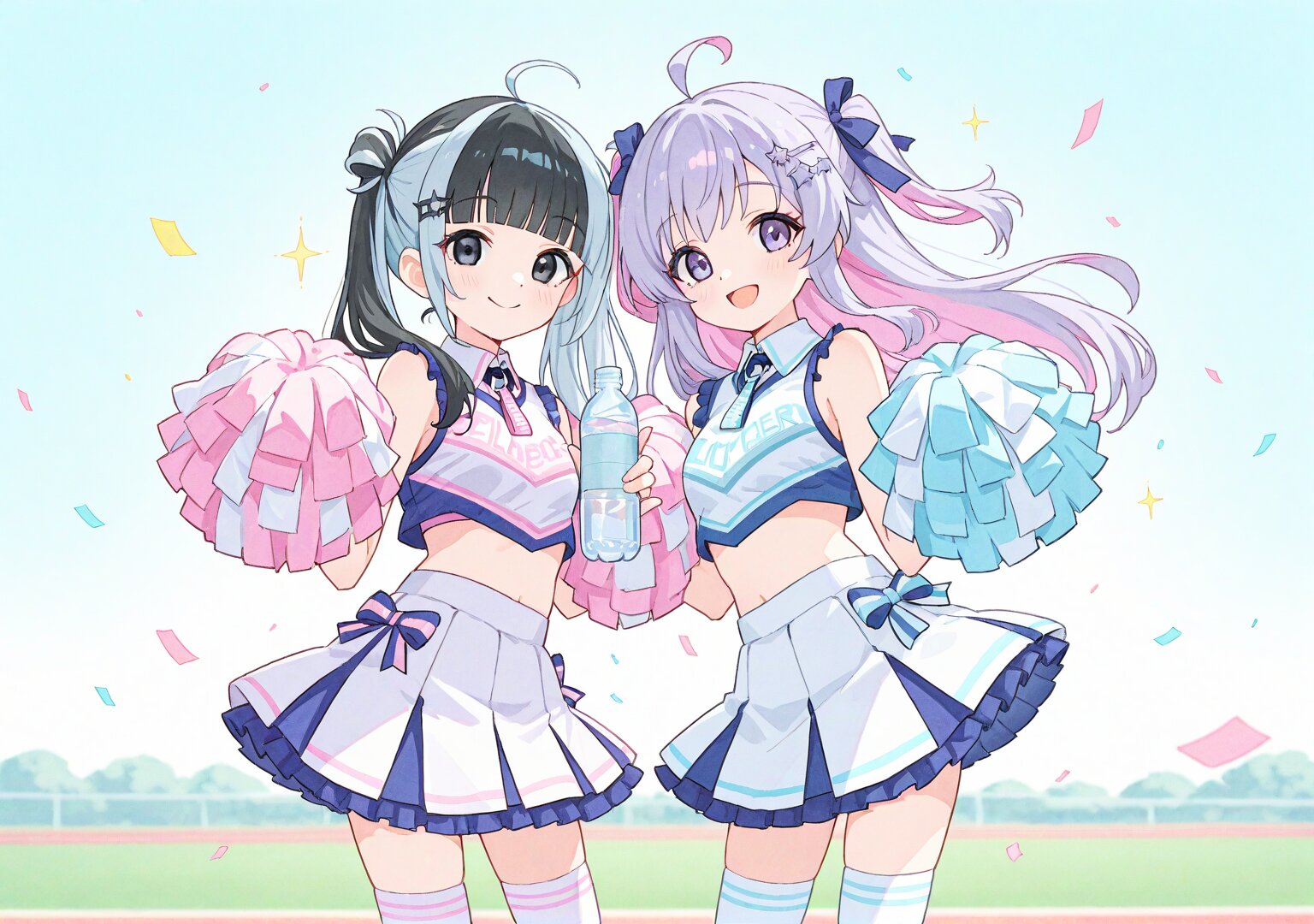 two girls wearing colorful cheerleader outfits, standing close together under soft sunlight, clinking plastic water bottles in a cheerful toast, smiling happily, bright pastel color palette, confetti in the air, soft wind, dreamy atmosphere, detailed pleated skirts, pom-poms at their sides, high quality, masterpiece, anime style, gentle depth of field, clean background with faint sports field and blue sky 1st girl: 1girl, blunt bangs, twintail, black eyes, split-color hair, two-tone hair (black and silver), cute jirai-kei style, subtle makeup, black and silver cheerleader outfit with frills and ribbons, thigh-high socks, holding a bottle up with a confident smile 2nd girl: ((soft cute girl with soft lavender hair and light blue inner highlights)), long hair with two side buns and loose curls, one stray hair (ahoge), large bright purple eyes, gentle smile, faint glow, star-shaped hairpin, pastel pink and white cheerleader outfit with frills and ribbons, holding a bottle up toward the other, light sparkle effect around them, (soft pastel color palette1.5), (pale colors:1.3), watercolor texture, matte finish, subtle shading, minimal contrast,