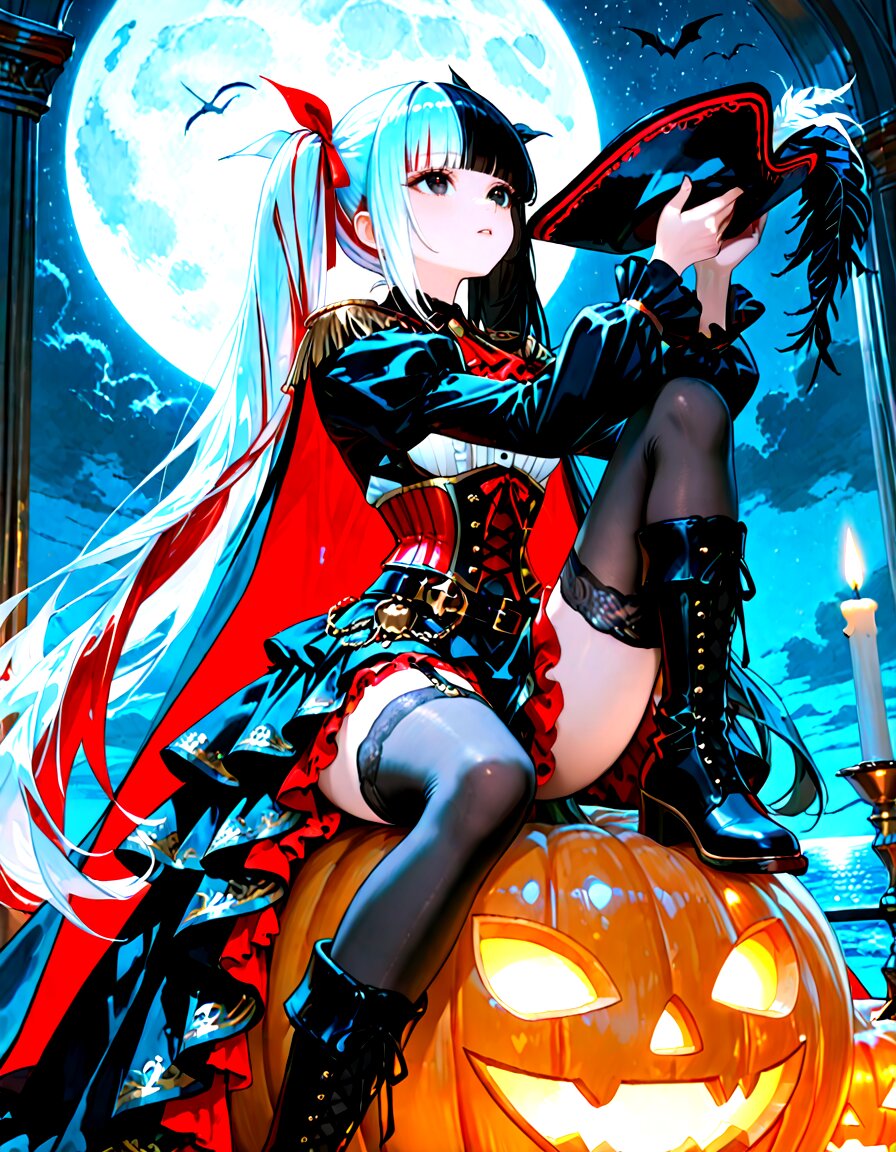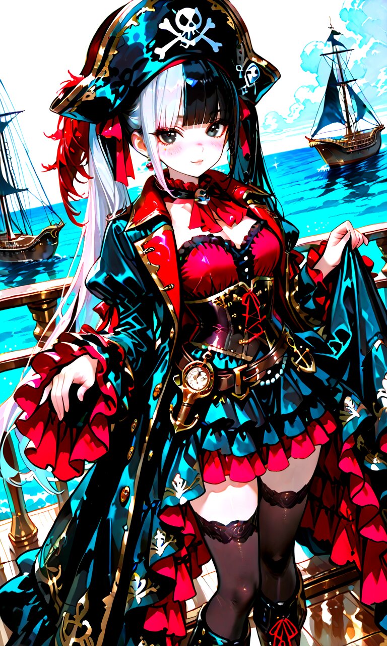Pirate Lolita outfit, elegant rococo-inspired pirate dress with frills, lace, and ruffles, corset bodice with gold embroidery, layered skirt with striped and velvet fabrics, puffed sleeves, long flowing coat with ornate buttons, waist belts with buckles and chains, thigh-high stockings with lace tops, heeled boots, tricorn hat with feathers, ribbons, and pearls, jewelry with anchors and compass motifs, dark navy blue, crimson, and gold color palette, detailed accessories, ocean breeze and fluttering cape