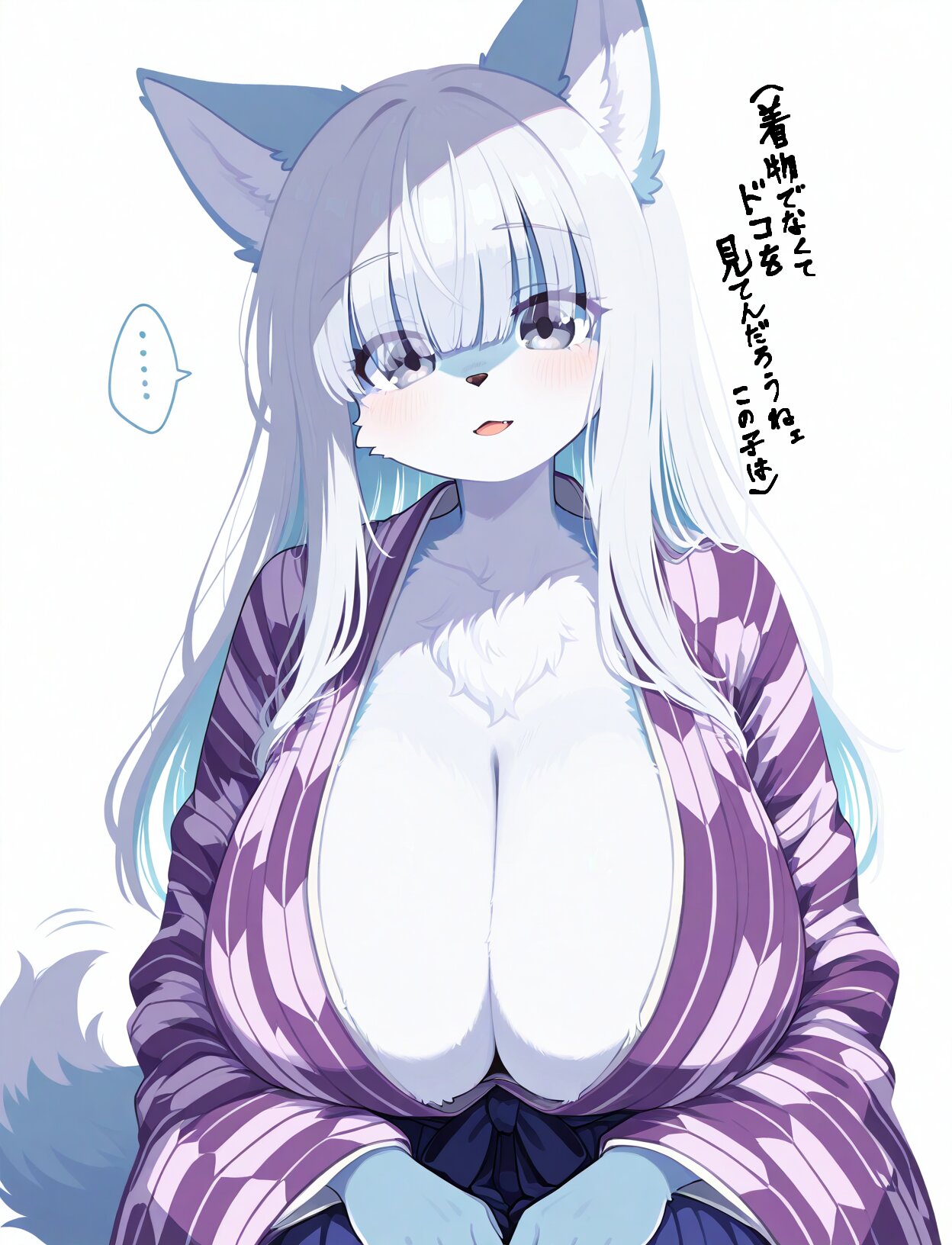 1girl, (wolf girl), (furry female), (snout:1.3), blue fur, wolf ears, ears up, wolf tail, fluffy fur, body fur, (gigantic breasts), sagging breasts, silver hair, hime-cut, long hair, colored inner hair, hair over eyes, silver eyes, long bangs, emphasized deep breasts cleavage, purple kimono, obi, blue hakama, yagasuri pattern kimono, light-smile, light open mouth, squatting, legs together, hands on lap, invisible floor, motion lines, motion blur, motion trail, afterimage, foreshadowing, spoken ellipsis, white outlines, white background, simple background, looking at viewer, breast focus, close-up, from front, hair shade, ((low contrast)), (digital art:1.1), (anime coloring), (kawaii), softy, (2D), (cute), furry, (two tone fur), (furry body), perfect body, detailed face, high quality, cute clothes, animal tail, animal ears, solo, masterpiece, ((correct_anatomy)), pretty and cute, comical, simple, anime, anime style, smooth lineart, clean and smooth lineart, thin and precise outlines, soft shading, vibrant colors, thin lineart, beautiful lineart, beautiful eyelashes, Bright colors, Contour line, pale painting, gddw, (detailed_hands:1.5), flat color, no lineart, close-up, eye focus