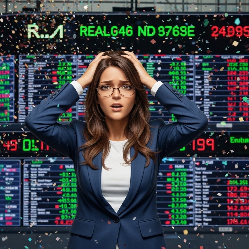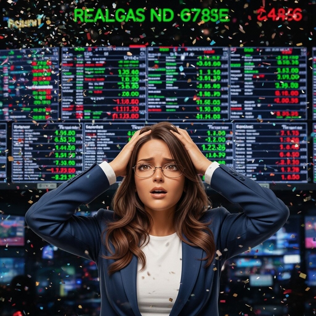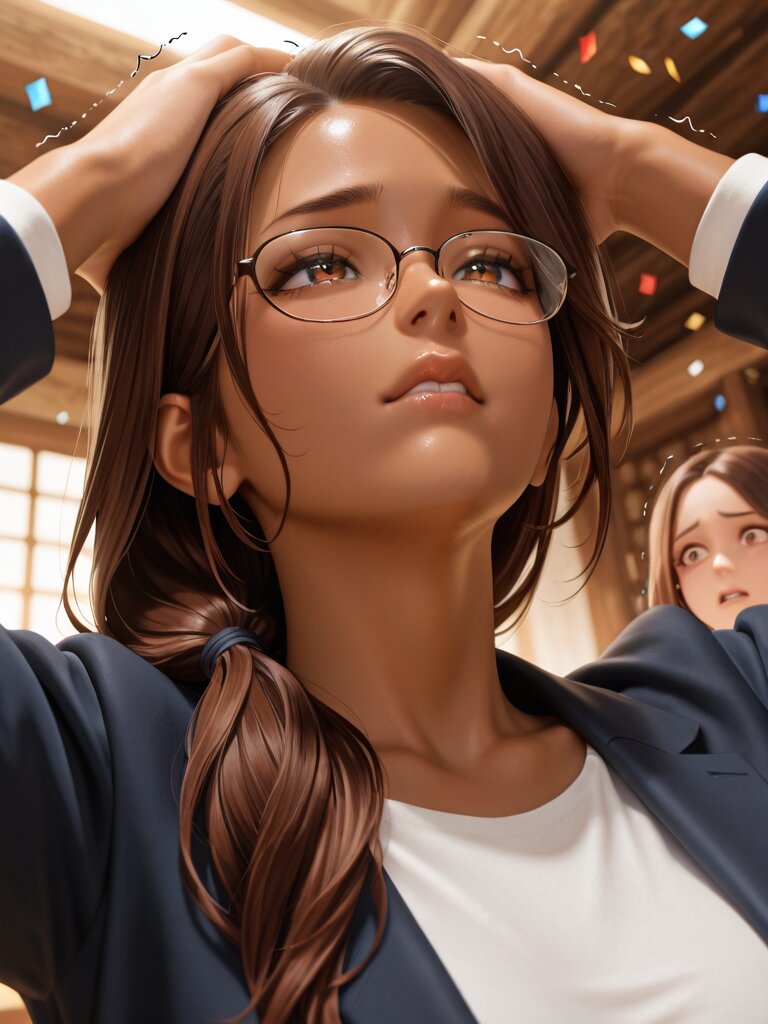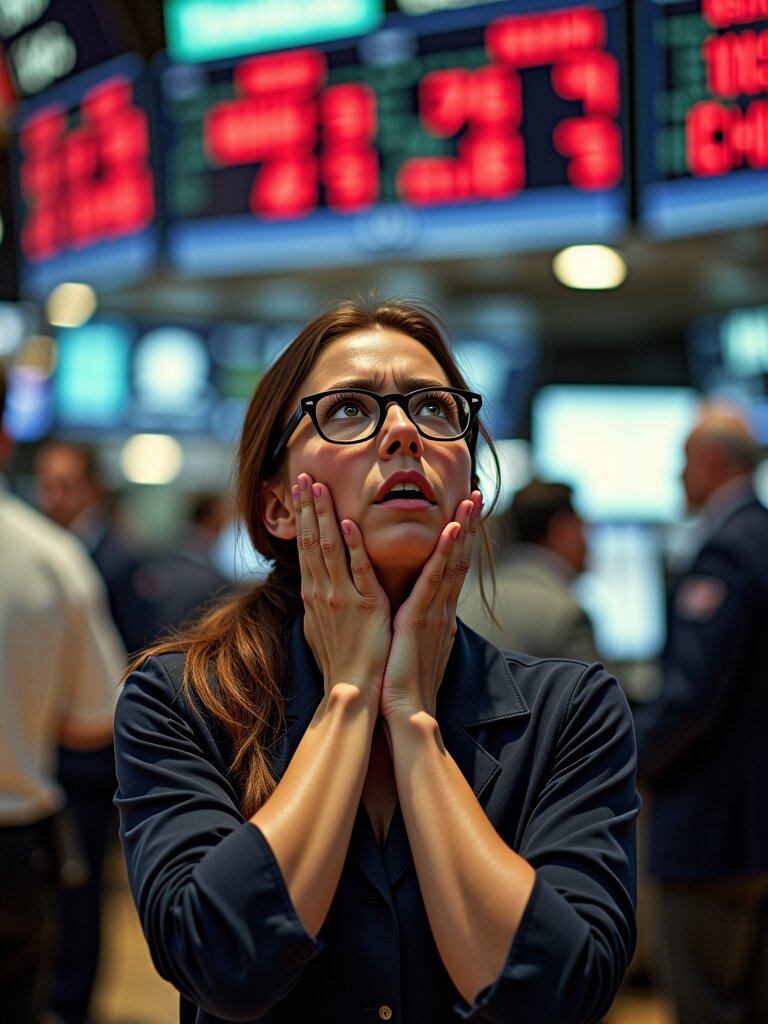 Masterpiece, Best Quality, Amazing Quality, Very Aesthetic, 4K, Very Aesthetic, High Resolution, Ultra-Detailed, Absurdres, Newest, 1Girl, Dark_Skinned_Female, Small_Breasts, Mature_Female, Aged_Up, Suit_Jacket, Blouse, Brown_Eyes, Glasses, Low_Tied_Hair, Parted_Bangs, Long_Hair, Red_Brown_Hair, Panicked, (Trembling_Lips:1.2), (Quivering_Lips:1.1), (Scared:1.1), (Darting_Eyes:1.1), Portrait, Standing, Hands_on_Head, Dynamic_Pose, Dynamic_Angle, Indoors, Stock_Trading_Market, Confetti, Dramatic_Lighting, BREAK, Depth of Field, Volumetric Lighting,