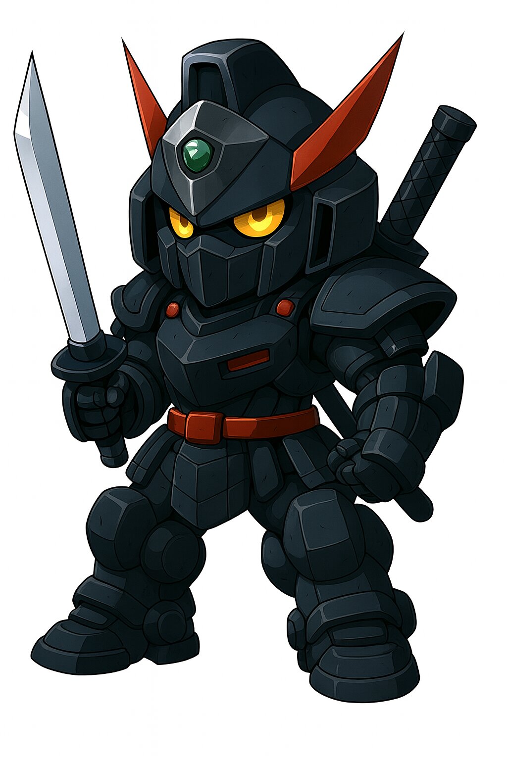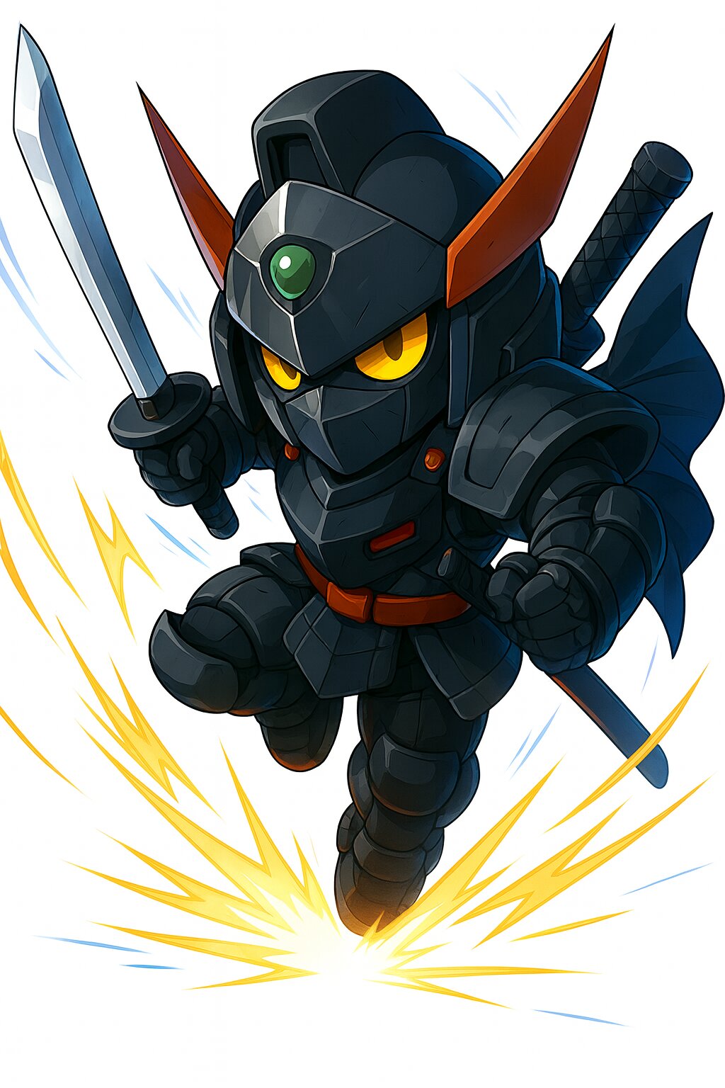全身は漆黒装甲(くろがねのよろい)で覆われ、光を吸い込むように鈍く輝く。