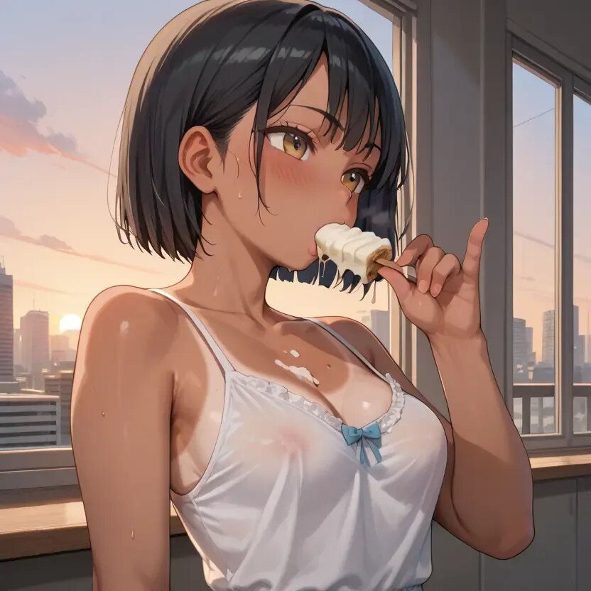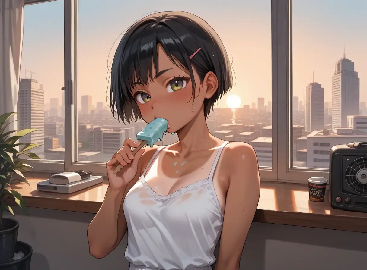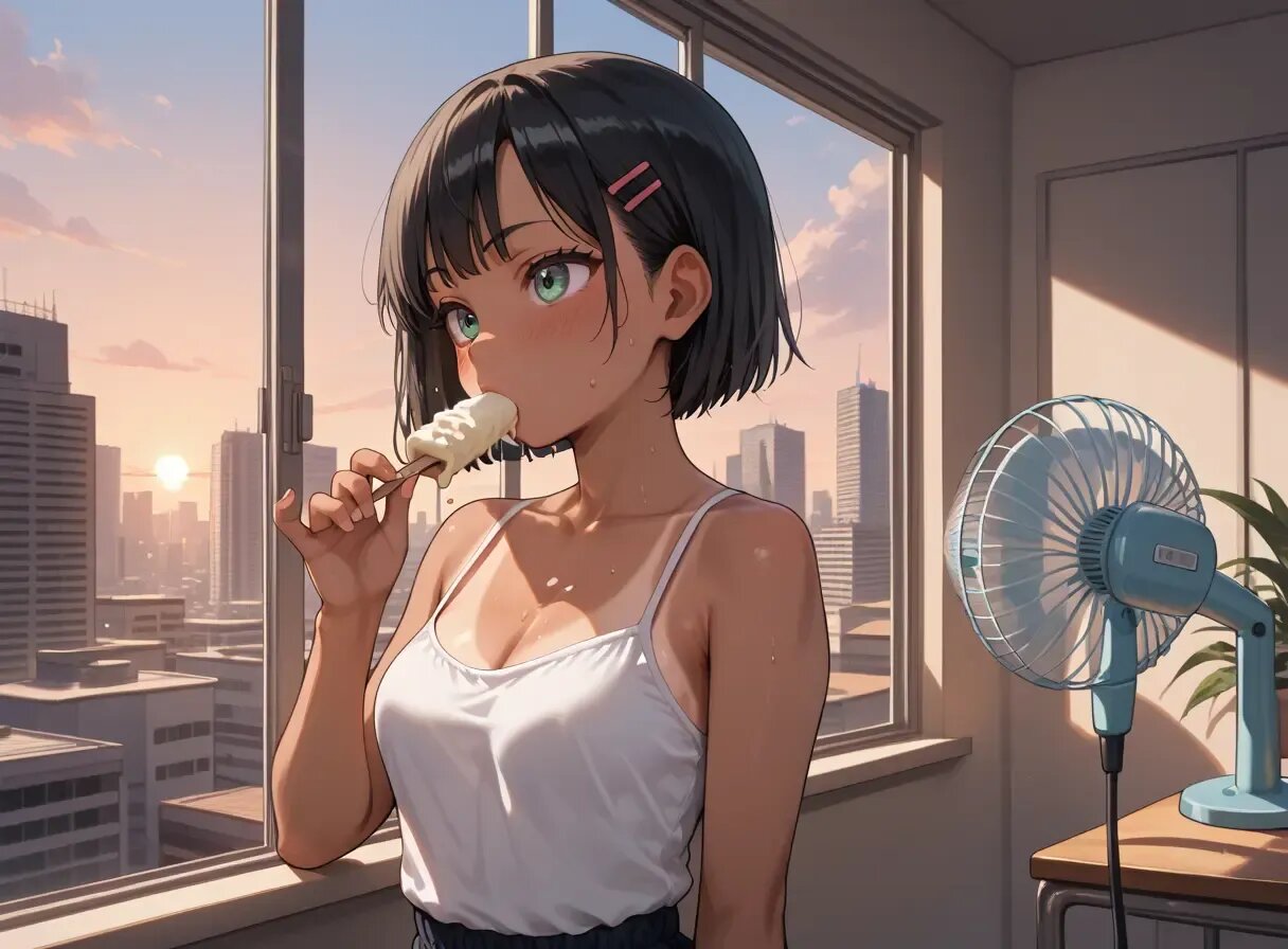 light_blush,sweat,1girl,mesugaki,early teen,loli,tan,slender,black hair,short hair,medium breasts,narrow_waist,giggling,My room, city, buildings, sunset, summer, window, eating ice cream, putting my face close to the electric fan, camisole, camisole half-removed,chest_Focus, ,tan,tanlines,