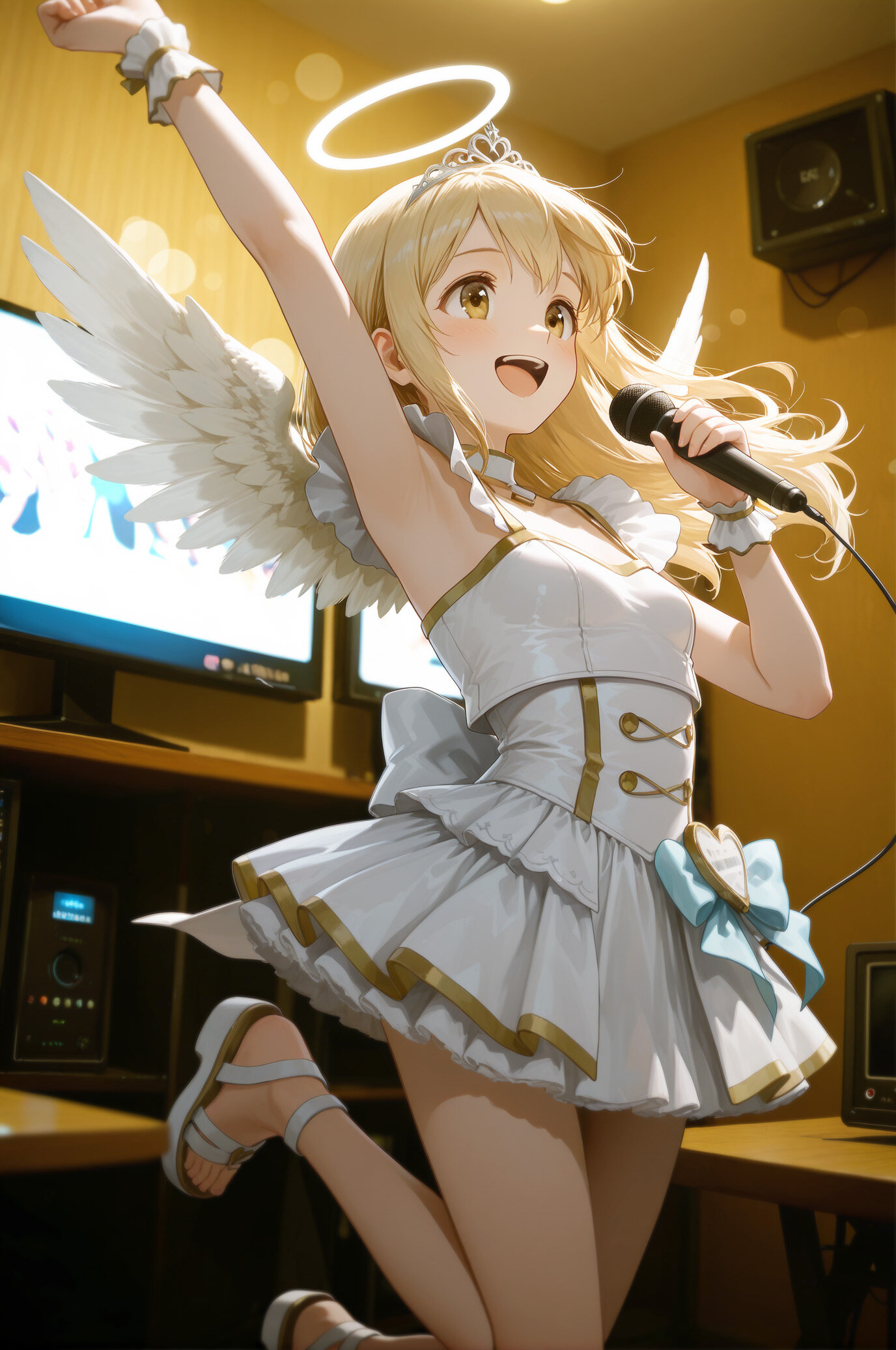masterpiece, best quality, absurdres, 8k, ultra detailed, aesthetic, very aesthetic, newest, <lora:Fixhands_anime_bdsqlsz_V1:0.5>, <lora:bold-16oa:-0.5>, (realistic:0.3),BREAK (bokeh,shallow depth of field,Gaussian Blur:1.6),1girl,(smile:1.3),1girl,blonde hair, long hair, brown eyes, (white angel wings:1.2),tiara,(singing:1.3),open mouth,(sandals:1.2),(beautiful brown eyes:1.1),(teen, cute,tareme:1.3),(white idol costume,mini skirt:1.2),<lora:j_karaoke_ilxl_v1:0.6>(j_karaoke,jumping,monitor,microphone,table:1.3),(cowboy shot,from front,wide angle,wide shot:1.3),from front, (small breasts :1.1),<lora:USNR STYLE_XL_loha:0.8>