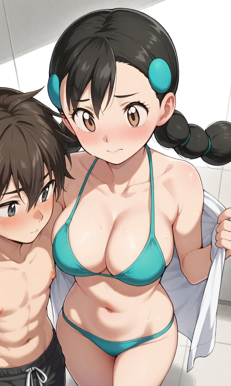 Couple, boy and girl, two people only,absurdres, ultra-detailed, master piece, high resolution, 8k, Boy, girl, couple,NSFW, masterpiece, best quality, extremely detailed, young woman, in thin blue bikini, standing confidently, young man, cold resentful glare, game-like training arena with pixelated backdrop, perfect anatomy, explicit tense anticipation. BREAK the boy(original boy,black eyes, black short hair) BREAK the girl(Candice,black_hair, brown_eyes, large_breasts, twintails, hair_ornament, ),