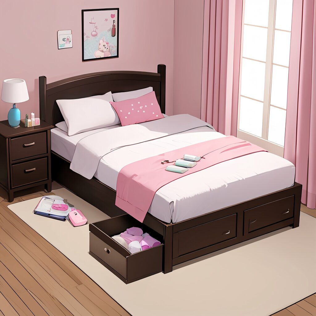 cozy girl's room, extremely cluttered with an overwhelming amount of menstrual products, Ultra-detailed 4K, realistic lighting. Three monitors neatly lined up on a desk, in front of a gaming chair. A cute bear plushie sits on the chair. A pink polka-dot bed with abundant sheets and blankets, curtains wide open to let in soft light. A Sanrio cow character-shaped alarm clock on the nightstand. A pale pink lampshade hanging from the ceiling. Storage boxes and baskets overflowing with makeup tools and accessories, manga magazines featuring reader models on the cover, fashion magazines also with reader models, books on cosmetics, and astrology books. A three-sided mirror on the desk, surrounded by basic skincare products, room diffusers, and aroma diffusers. Numerous cushions scattered on the bed and gaming chair. Romantic indirect lighting from a bedside lamp and fairy lights draped on the wall. Various potted plants and dried flowers. Photos and posters adorning the walls. An accessory stand overflowing with jewelry. A small waste bin, charging cables and power cords tangled nearby. A closet filled with clothes and underwear. A designated spot for a smartphone and small beauty creams for hydration. Stacks of soft towels. Notebooks, pens, planners, and a diary. Clothes hangers. An favorite cup with a drink and a tissue box are on the nightstand. A small rug on the floor. TV remote control. Secret books and tools hidden under the bed. The floor is completely covered, almost impossible to step, with countless unopened and opened packages of menstrual pads (various sizes: day, night, slim), tampons (boxes and individual wrappers), panty liners, and feminine wipes. Boxes are stacked precariously high, individual wrappers spill from baskets, and soft pads are piled everywhere, creating a soft, colorful, and overwhelming landscape of hygiene products across every available surface and corner of the room, on the bed, on the desk, spilling from drawers and baskets.