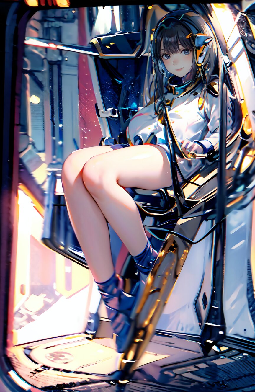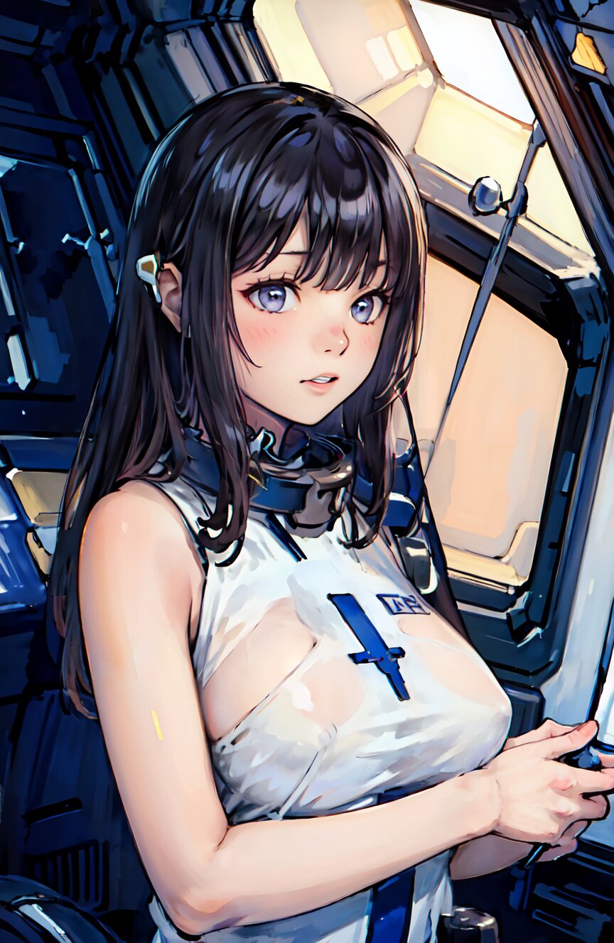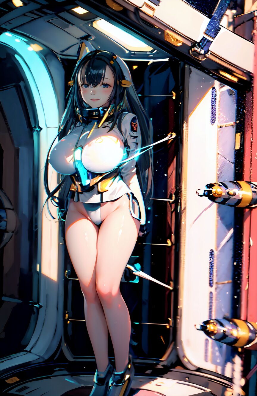 perfect anatomy, (masterpiece:1.3), (best quality:1.3), (ultra-detailed:1.2), 8K, HDR, (incredibly absurdres:1.2), (vibrant color:1.2), 1girl, solo, 16 years old, astronaut, (perfect body), plump, black hair, on back, (upper body: 1.6), huge breasts, (an extremely delicate and beautiful hands), nails, beautiful detailed ears, (intricate detail), highly detailed, beautiful detailed eyes, beautiful detailed glow, detailed light, shiny skin, shiny hair, (inside of spaceship: 1.8), <lora:miori_v02:1>