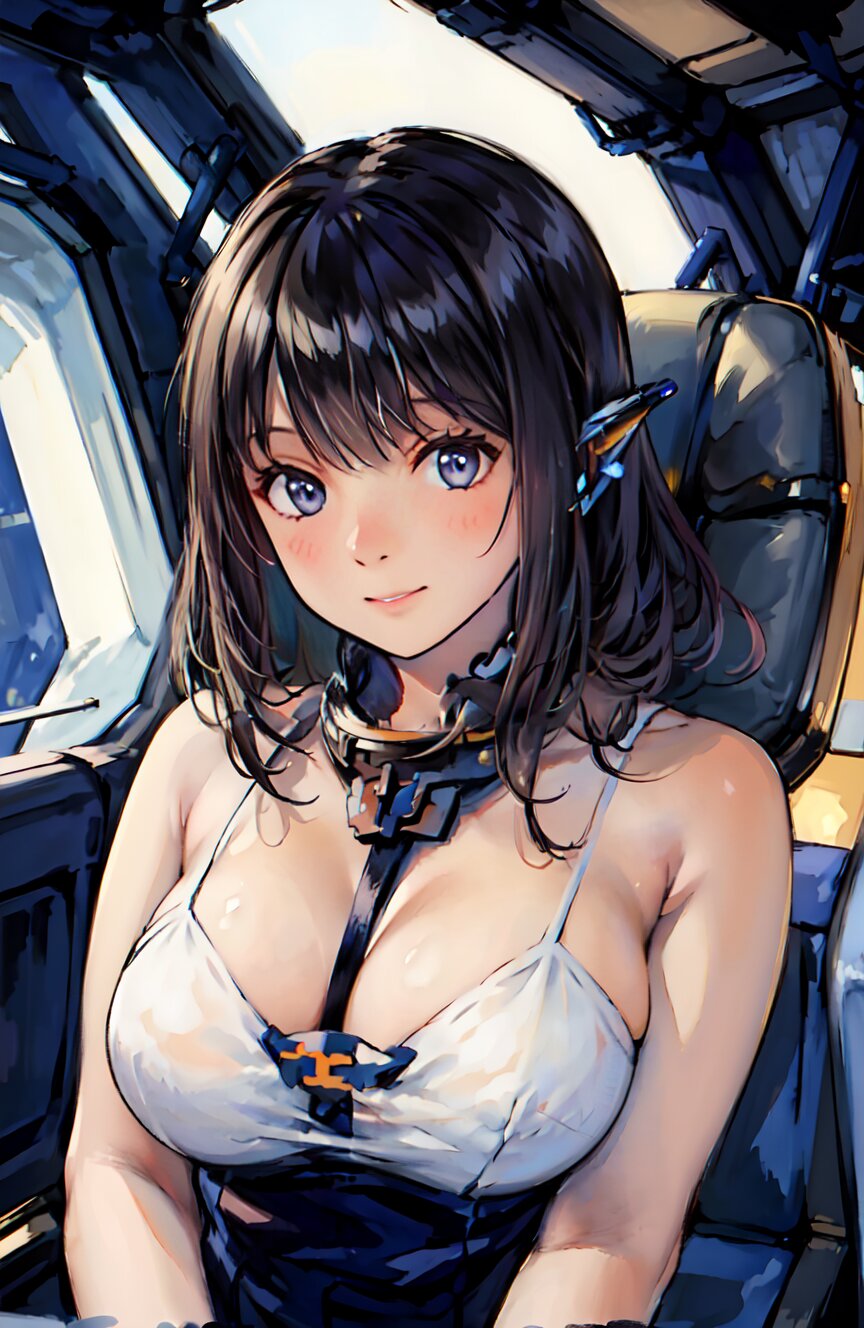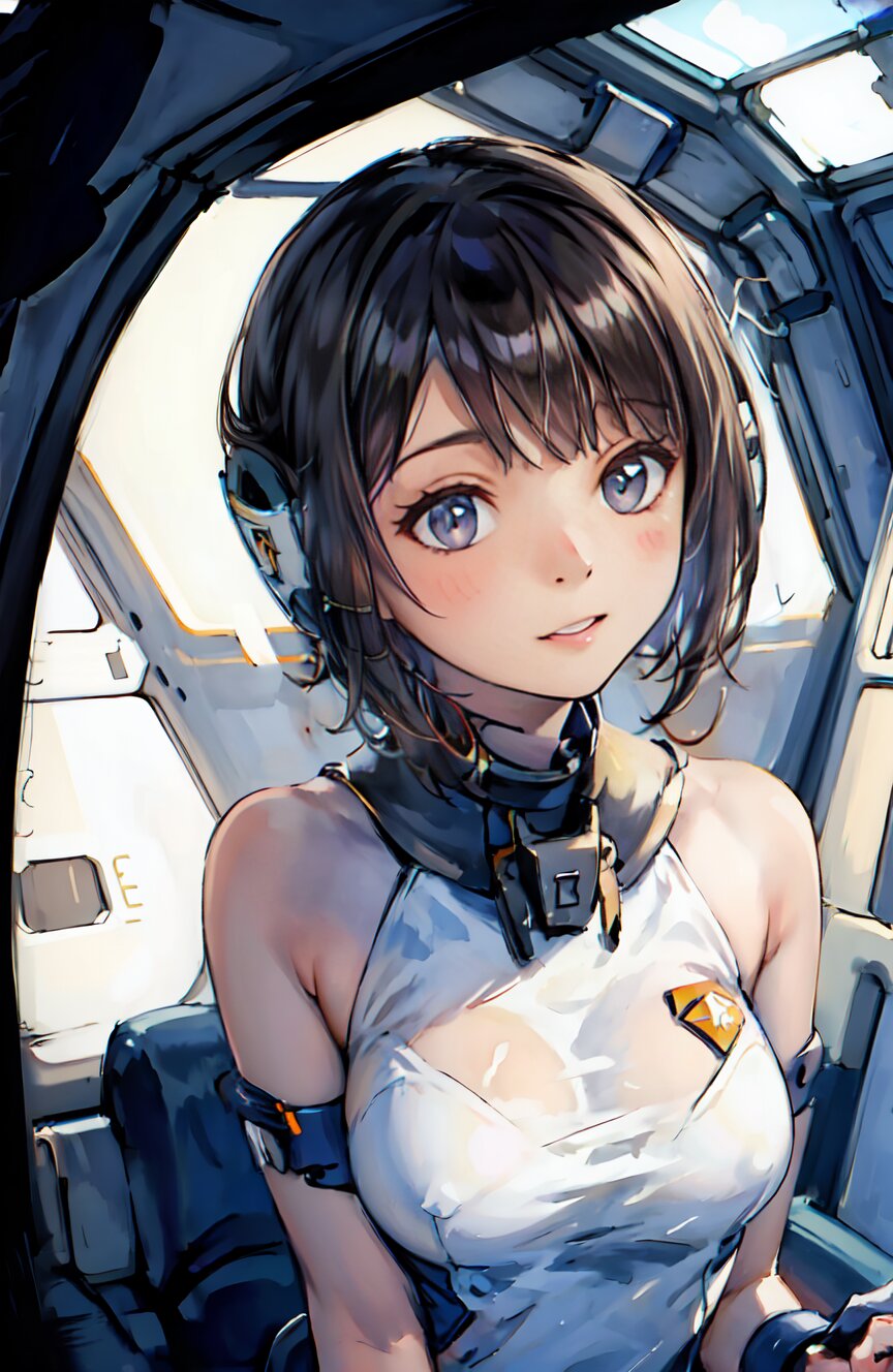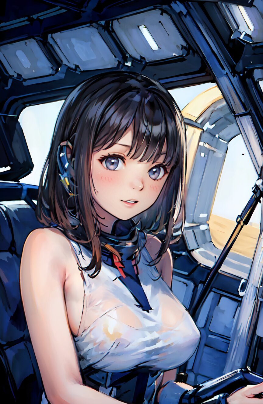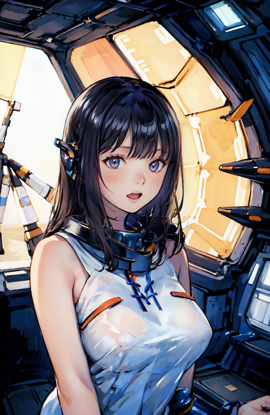 perfect anatomy, (masterpiece:1.3), (best quality:1.3), (ultra-detailed:1.2), 8K, HDR, (incredibly absurdres:1.2), (vibrant color:1.2), 1girl, solo, 16 years old, astronaut, (perfect body), plump, black hair, on back, (upper body: 1.6), huge breasts, (an extremely delicate and beautiful hands), nails, beautiful detailed ears, (intricate detail), highly detailed, beautiful detailed eyes, beautiful detailed glow, detailed light, shiny skin, shiny hair, (inside of spaceship: 1.8), <lora:miori_v02:1>