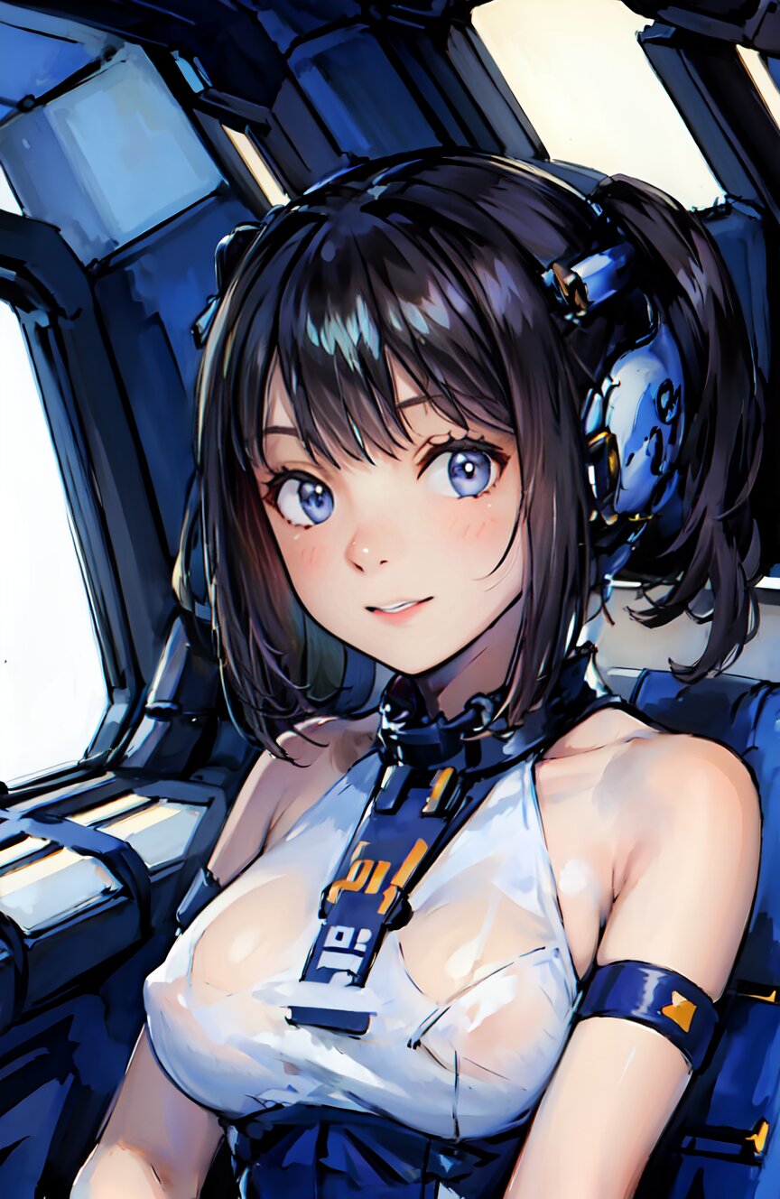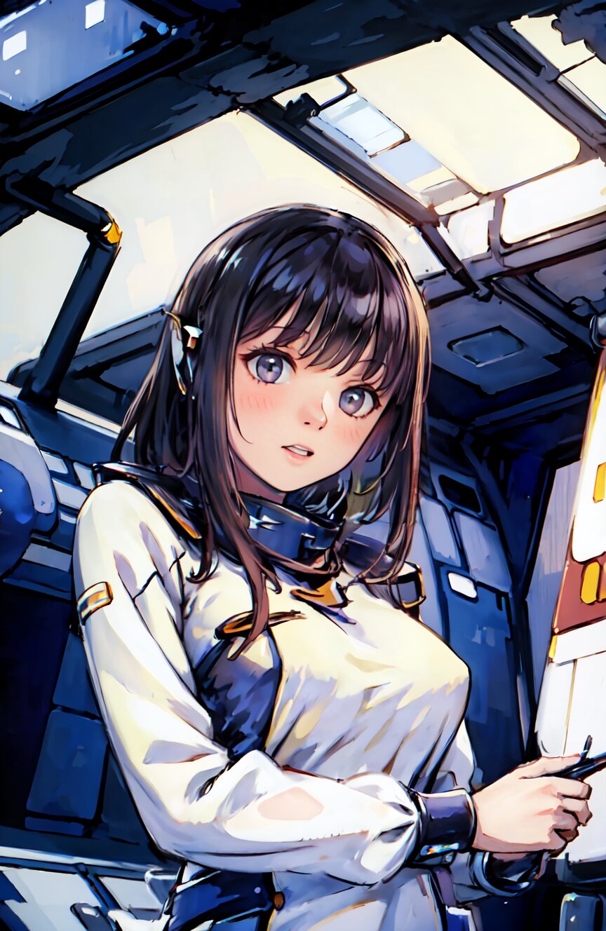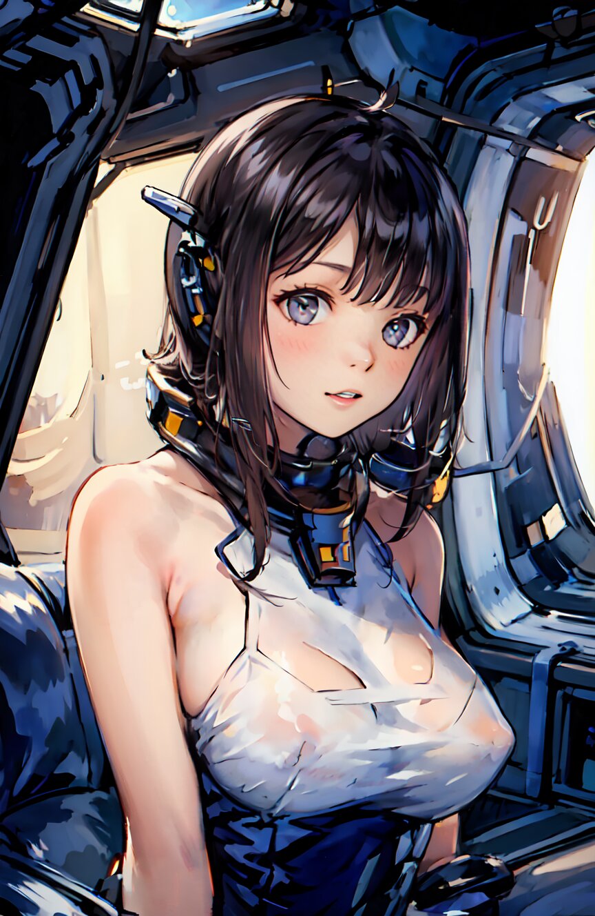 perfect anatomy, (masterpiece:1.3), (best quality:1.3), (ultra-detailed:1.2), 8K, HDR, (incredibly absurdres:1.2), (vibrant color:1.2), 1girl, solo, 16 years old, astronaut, (perfect body), plump, black hair, on back, (upper body: 1.6), huge breasts, (an extremely delicate and beautiful hands), nails, beautiful detailed ears, (intricate detail), highly detailed, beautiful detailed eyes, beautiful detailed glow, detailed light, shiny skin, shiny hair, (inside of spaceship: 1.8), <lora:miori_v02:1>