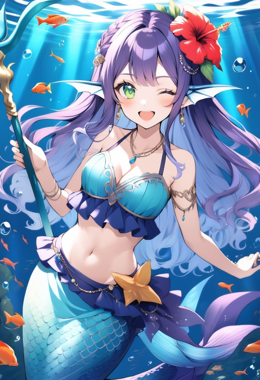 1girl, solo, 15years old, looking at viewer, monster girl, mermaid, sidelocks, long hair, multicolor hair, blue hair, purple hair, green eyes, hair flower, hair ornament, hibiscus, earrings, jewelry, necklace, head fins, off shoulder, bare shoulders, frills, blue bikini, holding staff, trident, armlet, large brests, cleavage, fins, fish, shell, navel, stomach, midriff, smile, open mouth, one eye closed, blush, underwater, air bubble, sunshine, ((illusion effect)),