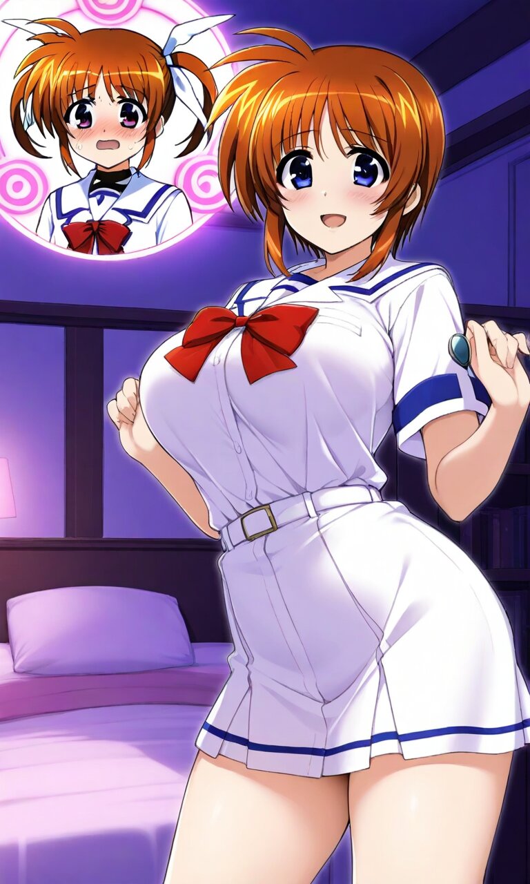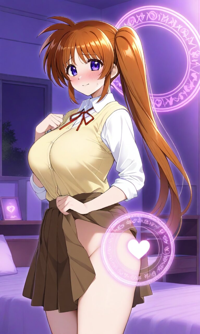 girl, takamachi nanoha,large breasts, brown hair,purple eyes, blue eyes, NSFW, masterpiece, best quality, extremely detailed, young woman, in school uniform, blouse, standing in glowing magical circle with blue and gold runes, nervous expression, soft-lit bedroom, perfect anatomy, explicit anticipatory magical transformation.
