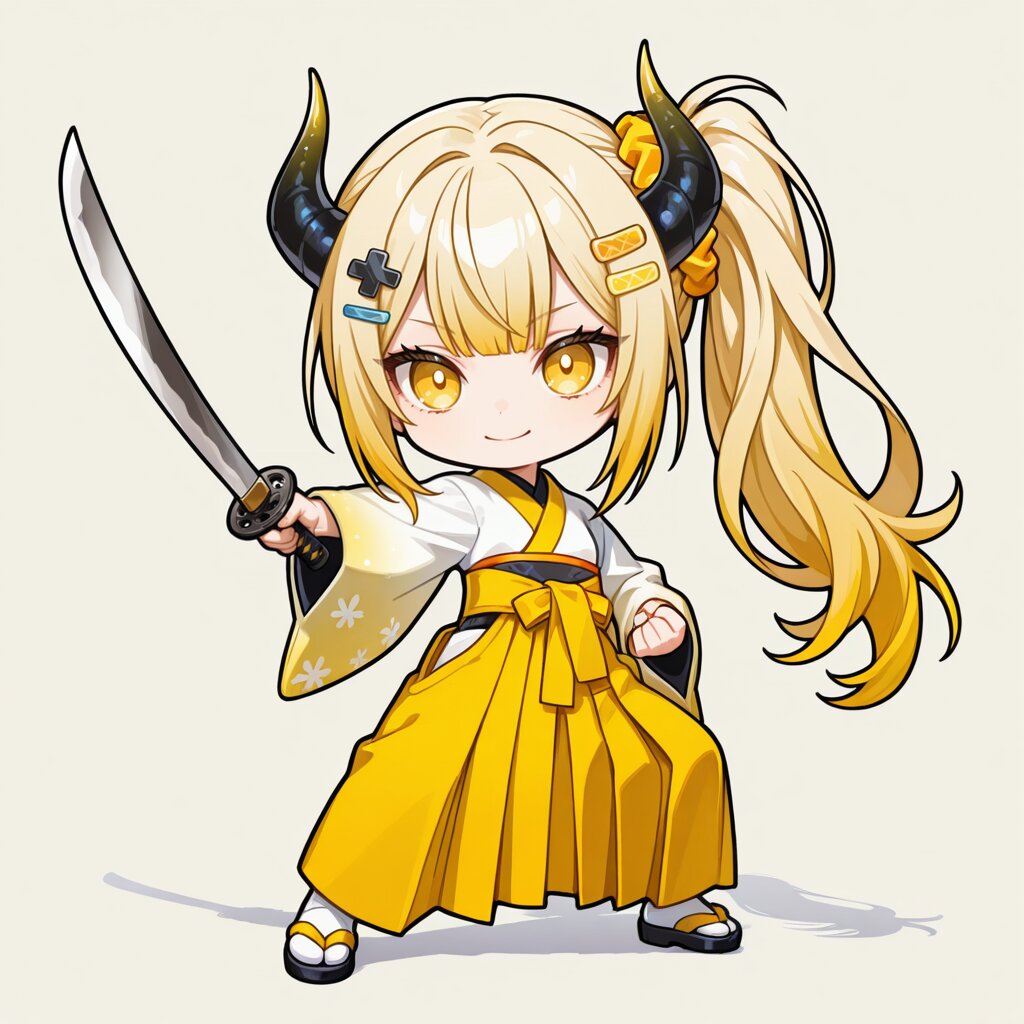 masterpiece,best quality,highres,highly detailed,detailed eyes,general,chibi,(holding a katana,fighting stance),1girl,solo17yo,(two demon horns,black horns),demon girl,small breasts,long sleeves,blonde hair,long hair,bangs,side ponytail,hair scrunchie,colorful hairclip,yellow eyes,closed mouth,smile,(long yellow japanese clothes,obi,long yellow hakama,long hakama pants),slender girl,full body,simple background,fantasy,