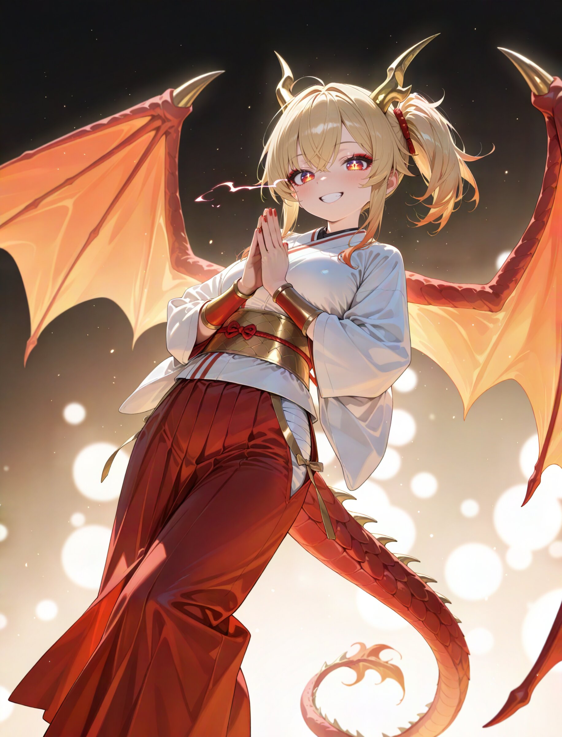 super fine concept art, hard surface, 8K, masterpiece, best quality, amazing quality, very aesthetic, absurdres, (low angle shot:1.15), feet out of frame looking at viewer, dynamic angle, simple background, congratulations, 1dragon girl, solo, dragon girl, 18yo, (2dragon gold horns attached to the head:1.2), (blonde hair:1.2) medium hair half updo hair up (side ponytail:1.3), red eyes beautiful iridescence eyes, (eyeshadow:1.2), cute, beautiful, (muscle,buff well-built body,ultra-detailed muscle:0.6) , first-rate female bodies perfect body framed breasts smart hips Average height, red nail polish, a dragon tail (2long red dragon wings on back:1.2), (red hakama:1.0) (overskirt:1.0) (White Japanese Clothes:1.0), sarashi inner, (White long sleeve:1.0) gold and white stripe obi, bracer, straw sandals, tabi, (shiny smile), clenched teeth, eye trail,, clapping, open mouth, own hands together, super fine concept art, hard surface, 8K, unreal engine, masterpiece, best quality, amazing quality, very aesthetic, absurdres, you can add scenery, (volumetric lighting), To make the background more distinctive. professional art lots of details, , overexposure, shiny-glistening, (watercolor style:1.0), (pastel color style:1.0) 4ur4_illu,shiny, glowing, glowing particles, glowing light particles, light particles, white petunia , <lora:noline (1):-0.5> <lora:sdxl2-flat2-512b:0.2> <lora:facelightup_xl_v10:0.5> <lora:V2_yakumo_alchemy:0.4> <lora:Aura_illu:0.2>