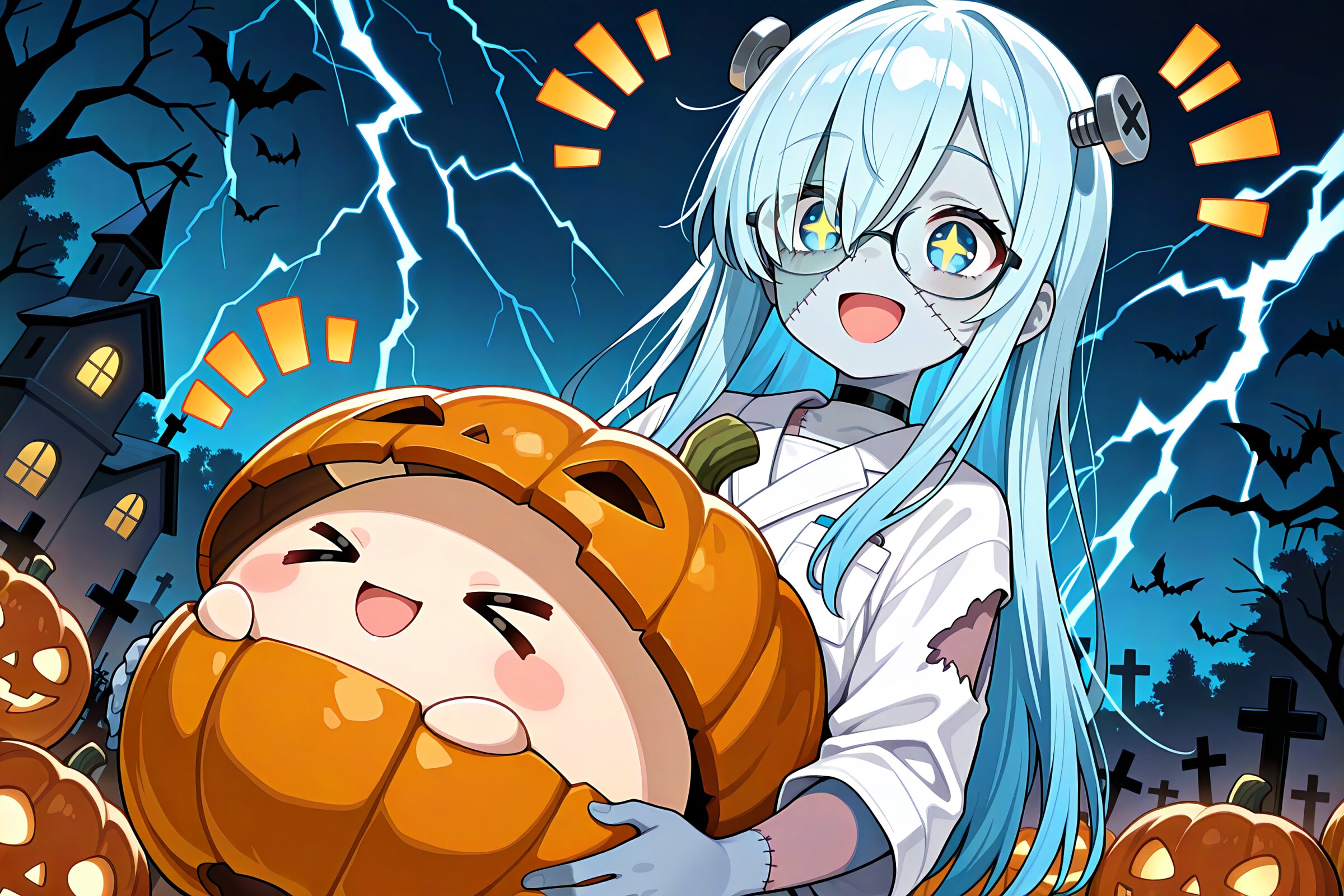 1 little girl, solo, diagonal angle, masterpiece, best quality, amazing quality, very aesthetic, sky blue hair, long hair, straight hair, blue eyes, +_+, open mouth, smile, cheerful, +++, notice lines, choker, (zombie skin:1.2), doctor outfit, torn clothes, patchwork clothes, patchwork skin, glasses, screw headware, (holding humpty dumpty,:1.2) > <, holding pumpkin, halloween, night, pumpkin, bat, graveyard, lightning, thunder, sound effects, lightning background,