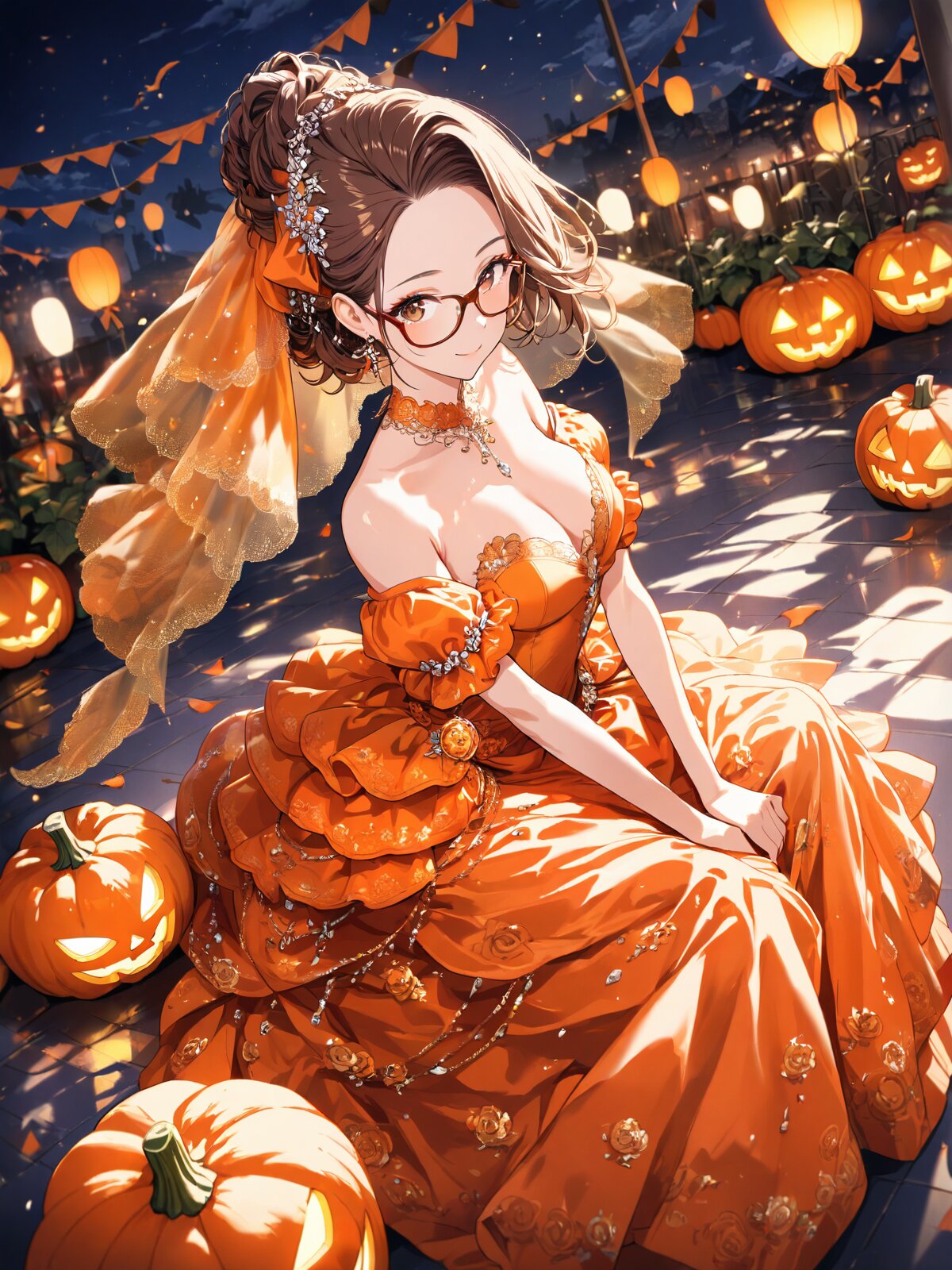 (8k, Ultra Super Fine detailed, beautiful illustration), 8k resolution, masterpiece, beautiful highlight, expression eyes, beautiful eyes, solo, detailed hair, elegant pose, detailed eyes, elegant make up, Halloween party, elegant smile, night, carnival,, pumpkin, orange elegant wedding dress, long skirt, elegant mask, woman, forehead, glasses, brown hair, brown eyes, short hair,