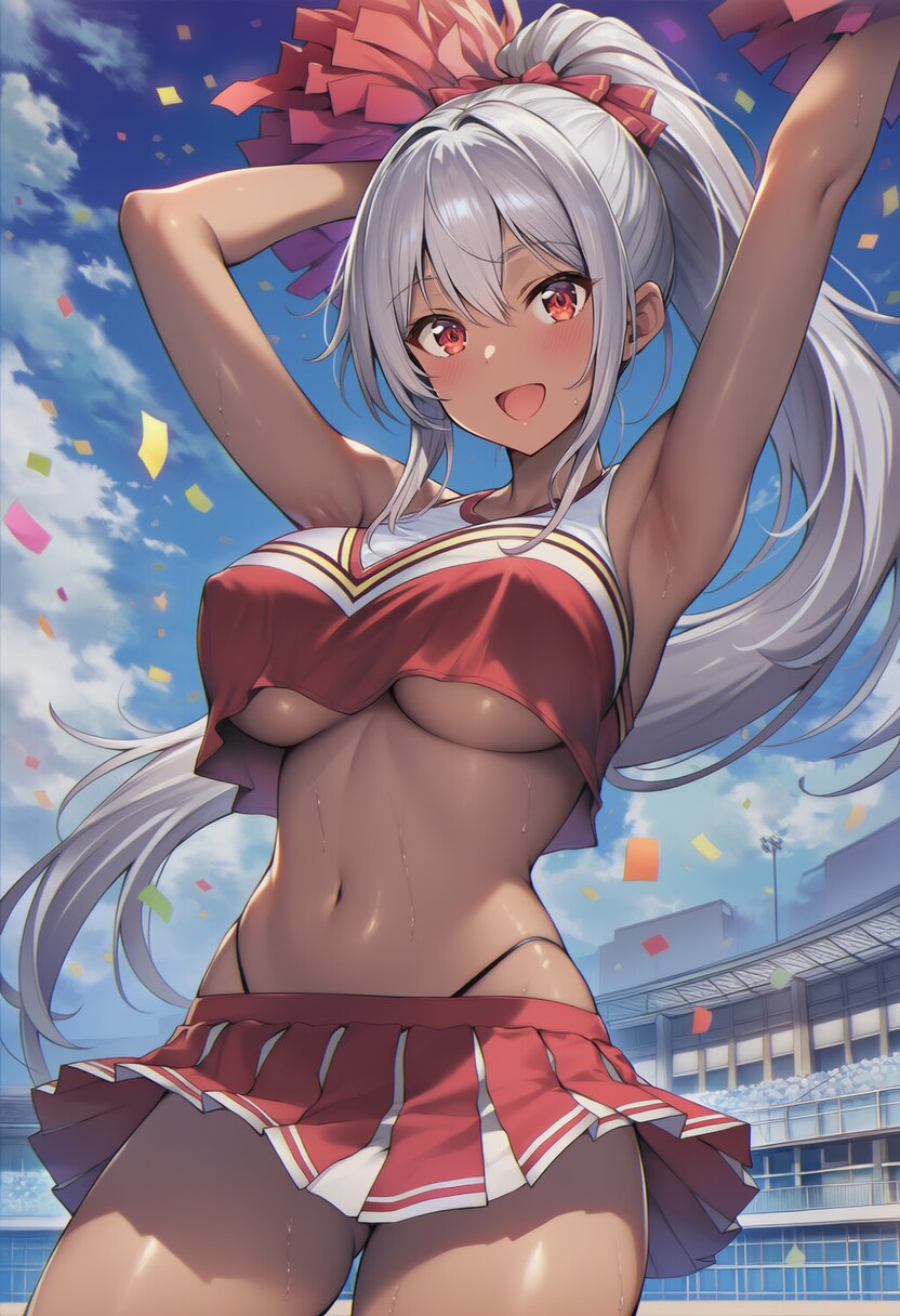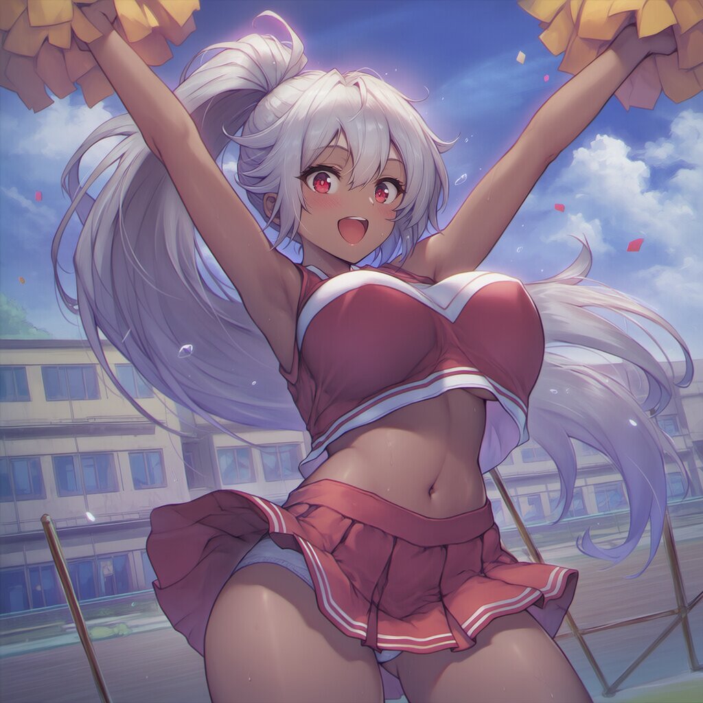 {{{highly detailed}}}, {{official style}}, {100-layer}, {{{ultra-high resolution}}}, {{{hi-vision anime}}}, {{intricate}}, {{{detailed beautiful eyes, detailed beautiful face, detailed beautiful face and eyes}}}, 1girl, solo, red eyes, very long hair, silver hair, hair between eyes, ponytail, {{{dark skin}}}, large breasts, open mouth, happy, blush, {{smile}}, navel, wearing red cheerleader costume, mini skirt, {{{holding a pompon}}}, arms up, cowboy shot, blue sky, {{sports day, school, schoolyard, outdoors}}, {{{masterpiece}}}, {{{best quality}}}, {{{very aesthetic}}}, {{{ultra-detailed}}}, {illustration}, {{{extremely detailed}}}, {{{an extremely delicate and beautiful}}}