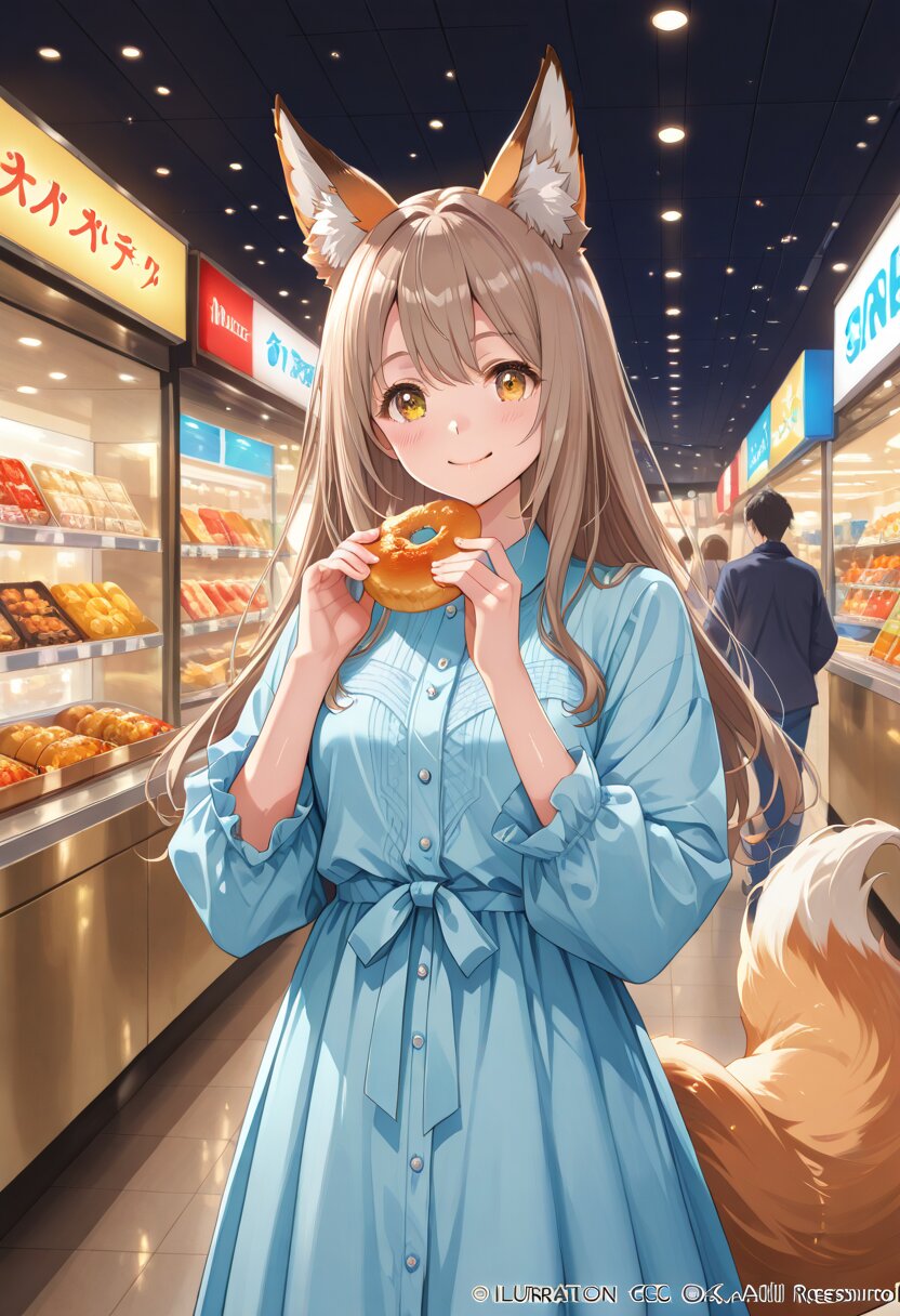 (high resolusion,illustration,ultra detailed 8k art,extremely detailed CG,official art,clothes reflecting light,detailed shiny skin,detailed background:1.3), ((highly detailed beautiful face and eyes),anime style, fox ears girl, light brown hair, long hair, double eyelids, long eyelashes, fluffy tail, food court on tuesday, holding shumai, casual outfit, cheerful expression, shopping mall background, warm lighting, pastel tones, fantasy realism, cinematic composition, ultra-detailed