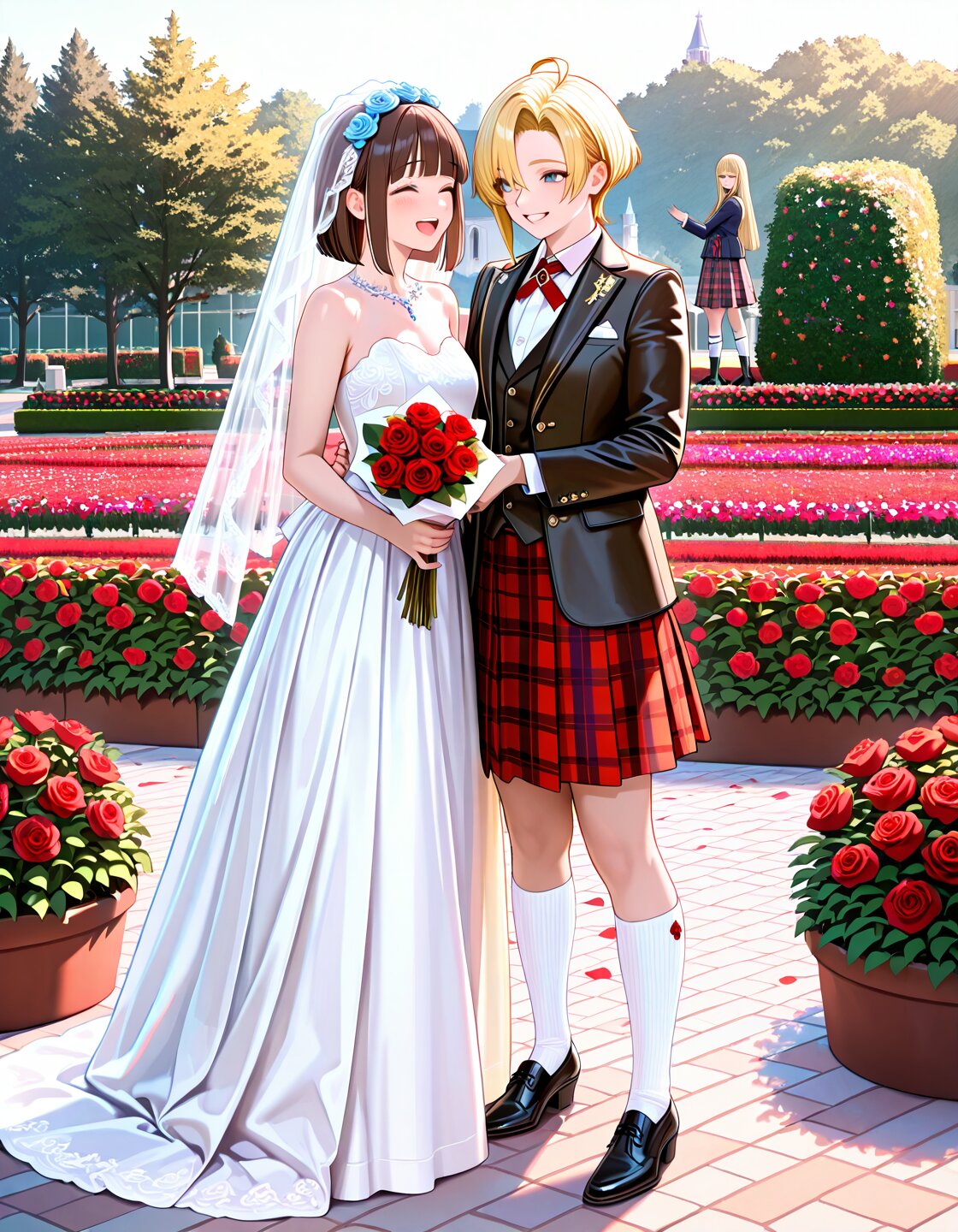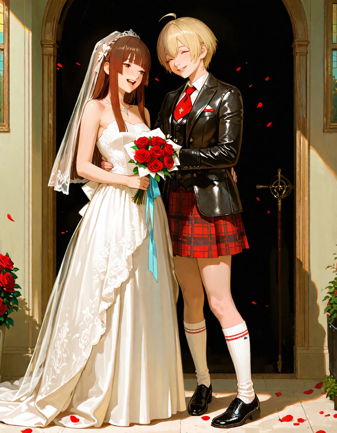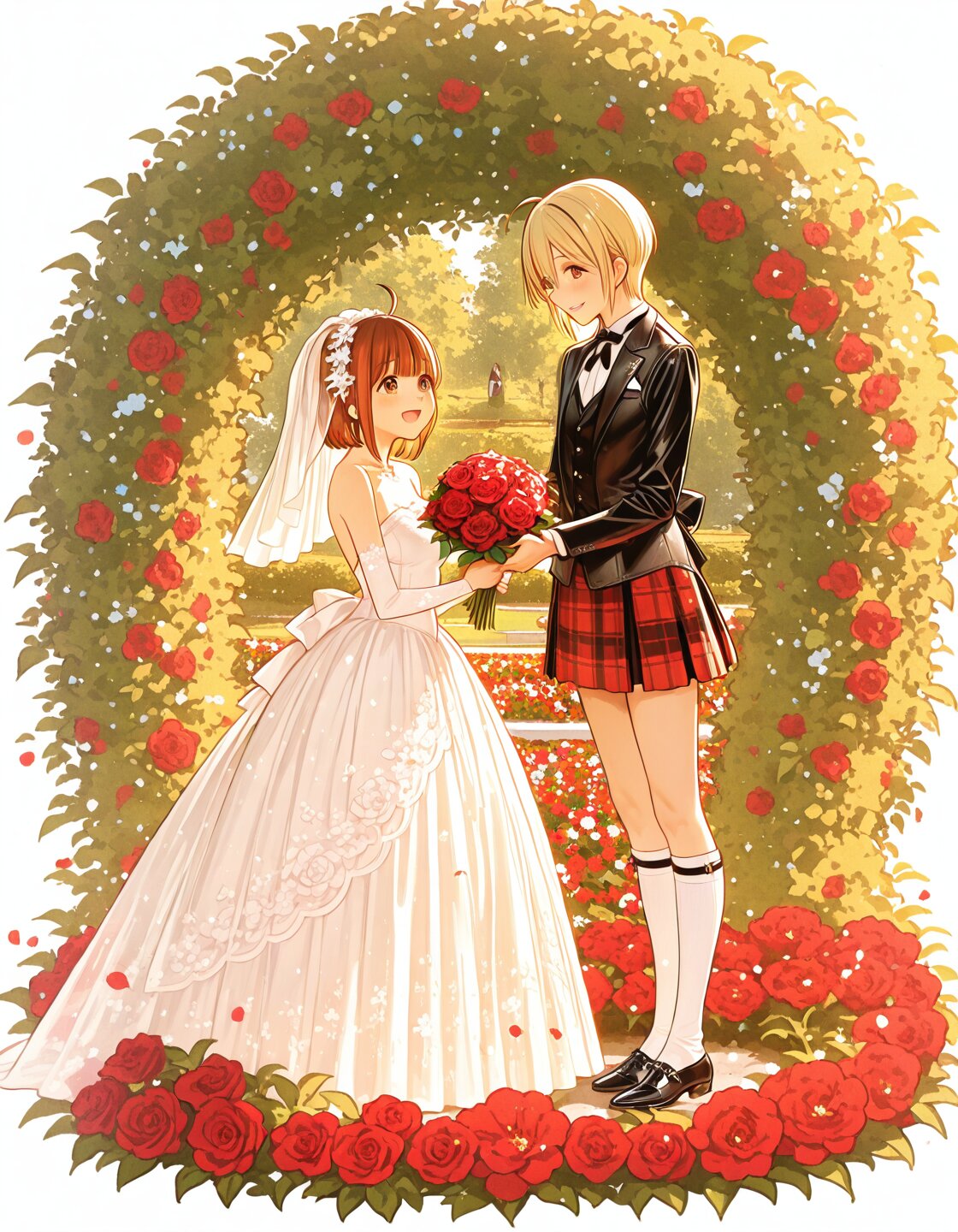 2persons,couple,delicate face,detailed face,detailed skin,masterpiece,best quality,insanely detailed,beautiful,16k,exquisite,absurdres,folk art,light atmosphere,romantic academia,vibrant academia,sunlight,lens flare,bloom,soft lighting,shining lights,at wedding,Happy Scene,(A small countryside church in Scotland:1.3),(A newlywed couple stands outside the chapel under a soft golden light:1.3),(in rose garden:1.2),The mood is emotional and heartfelt—a moment of happiness,farewell,and a new beginning,outside,stone chapel,stained glass,(surrounded by green hills and blooming wild red roses:1.3),realistic illustration AND (2persons:1.2),(bride:1.3),ahoge,brown hair,short hair,straight hair,hime cut,brown eyes,blunt bangs,cheerful,laughing,standing,gently hold each other's right hands and lovingly gaze into each other’s eyes,wearing a delicate white wedding dress with lace details,a soft blue accessory ("something blue"),holding a bouquet of red and white roses in her left hand,realistic illustration,full body AND (2persons:1.2),(groom:1.3)ahoge,blonde hair,short hair,straight hair,hime cut,greeen eyes,blunt bangs,happy,smiling,standing,gently hold each other's right hands and lovingly gaze into each other’s eyes.wearing a traditional Scottish red tartan kilt and formal jacket,a leather sporran on the front of Kilt,wearing off white knee socks and black shoes,realistic illustration,full body
