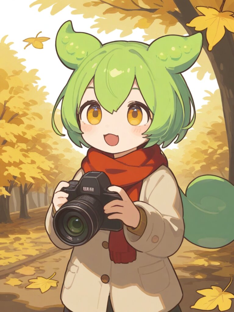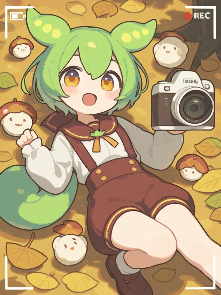 zundamon,voicevox Autumn fields, lots of mushrooms, autumn leaves, photographed with a film camera