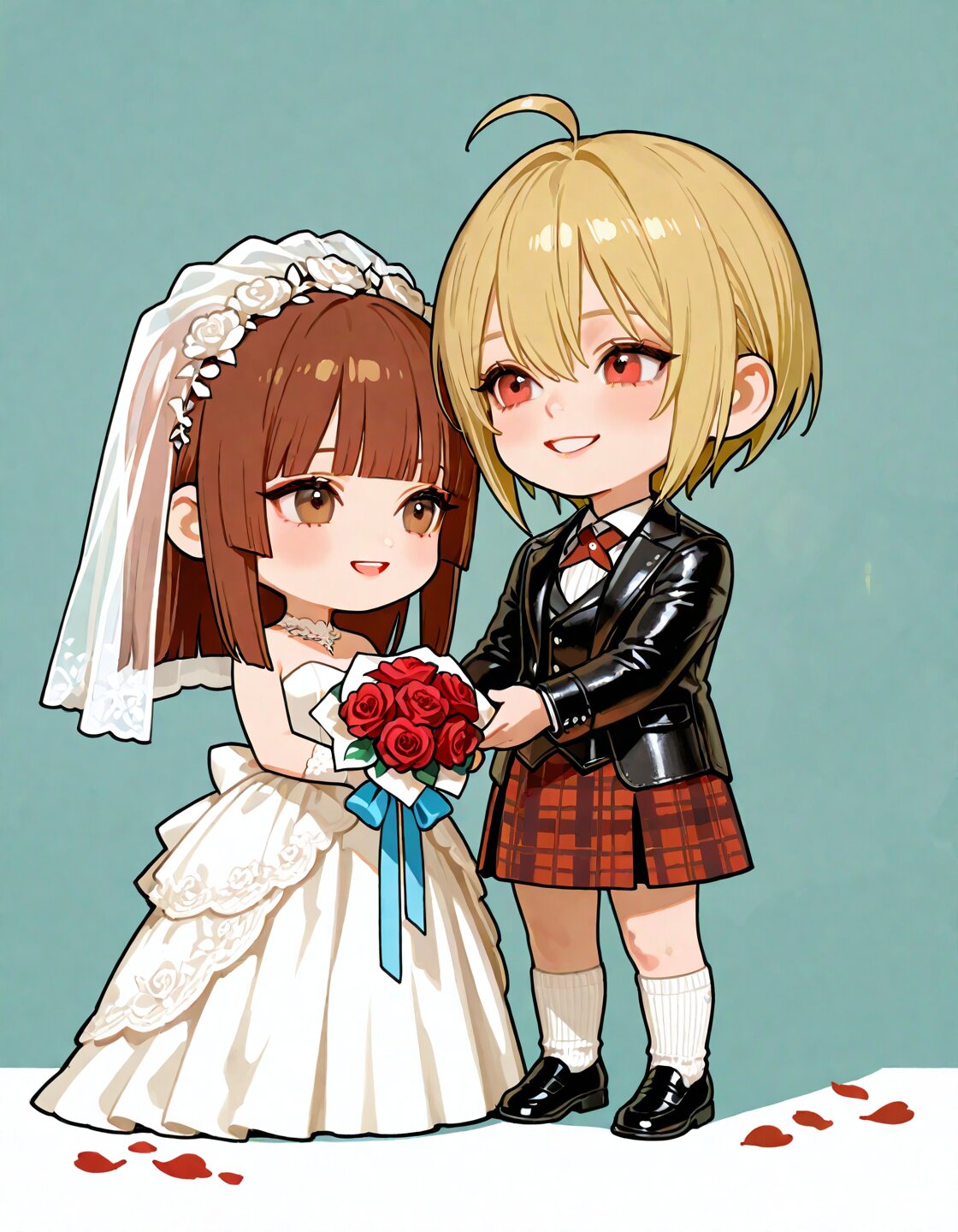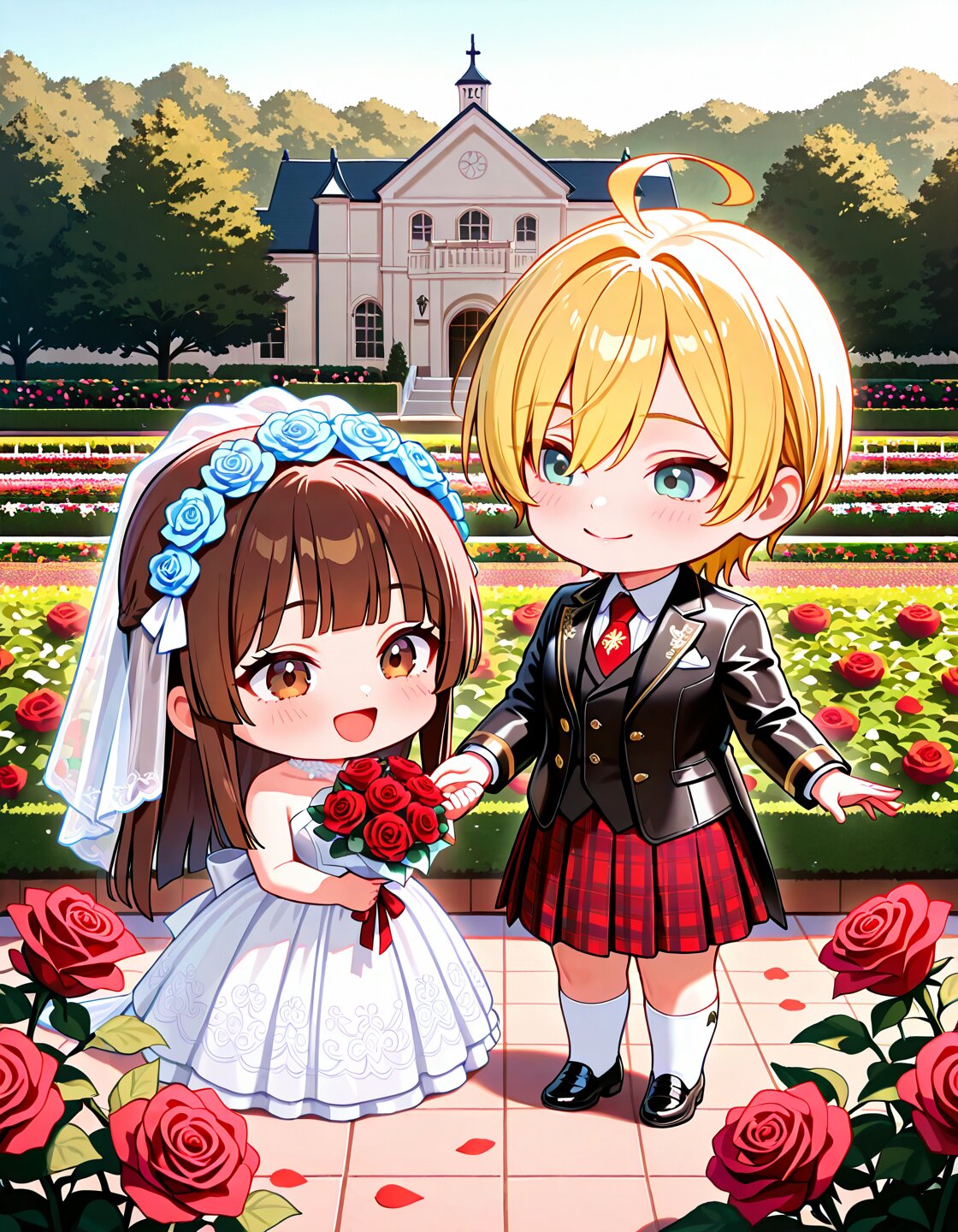 2persons,couple,delicate face,detailed face,detailed skin,masterpiece,best quality,insanely detailed,beautiful,16k,exquisite,absurdres,folk art,light atmosphere,romantic academia,vibrant academia,sunlight,lens flare,bloom,soft lighting,shining lights,at wedding,Happy Scene,(A small countryside church in Scotland:1.3),(A newlywed couple stands outside the chapel under a soft golden light:1.3),(in rose garden:1.2),The mood is emotional and heartfelt—a moment of happiness,farewell,and a new beginning,outside,stone chapel,stained glass,(surrounded by green hills and blooming wild red roses:1.3),(surrounded by friends tossing flower petals in a joyful flower shower:1.3),realistic illustration AND (2persons:1.2),girl,(bride:1.3),ahoge,brown hair,(short hair,:1.2)straight hair,hime cut,brown eyes,blunt bangs,cheerful,laughing,standing,gently hold each other's right hands and lovingly gaze into each other’s eyes,wearing a delicate white wedding dress with lace details,a soft blue accessory ("something blue"),holding a bouquet of red and white roses in her left hand,realistic illustration,full body,(chibi:1.5) AND (2persons:1.2),femboy,(groom:1.3)ahoge,blonde hair,(short hair,:1.2)straight hair,hime cut,greeen eyes,blunt bangs,happy,smiling,standing,gently hold each other's right hands and lovingly gaze into each other’s eyes.(wearing a traditional Scottish red tartan kilt and formal jacket:1.3),(a leather sporran on the front of Kilt:1.3)(wearing off white knee socks and black shoes:1.3),realistic illustration,full body,(chibi:1.5)