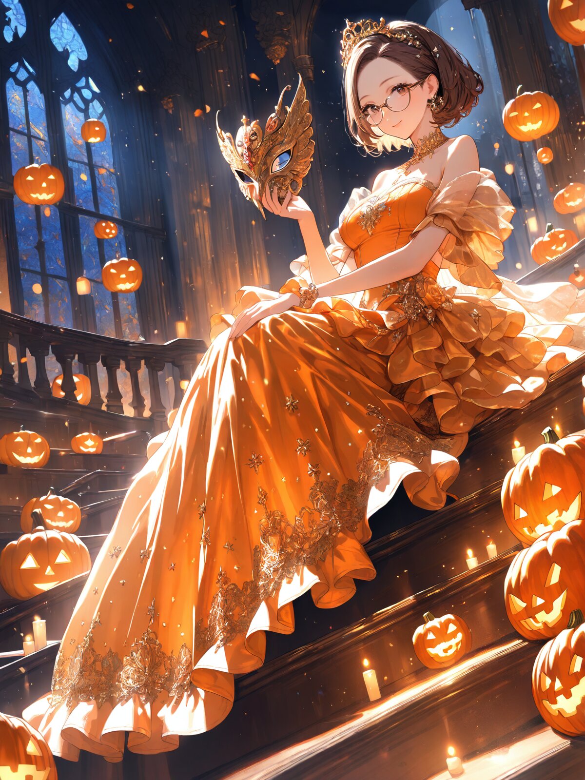 (8k, Ultra Super Fine detailed, beautiful illustration), 8k resolution, masterpiece, beautiful highlight, expression eyes, beautiful eyes, solo, detailed hair, elegant pose, detailed eyes, elegant make up, Halloween party, elegant smile, night, carnival,, pumpkin, orange elegant wedding dress, long skirt, elegant mask, woman, forehead, glasses, brown hair, brown eyes, short hair, Gothic, beautiful long train dress, back angle, upper angle, chapel, stairs, sit-down,