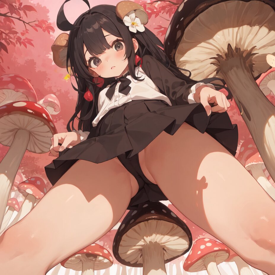 masterpiece, best quality, 1girl, kawaii, Miniskirt, standing, (((((legs apart))))), black hair, long ahoge, 1 long Mushroom, caught on girl's in her flipped-up Miniskirt, the Mushroom stucking in the girl’s crotch, in Mushroom Forest,